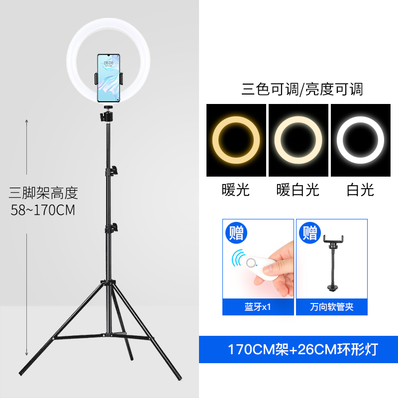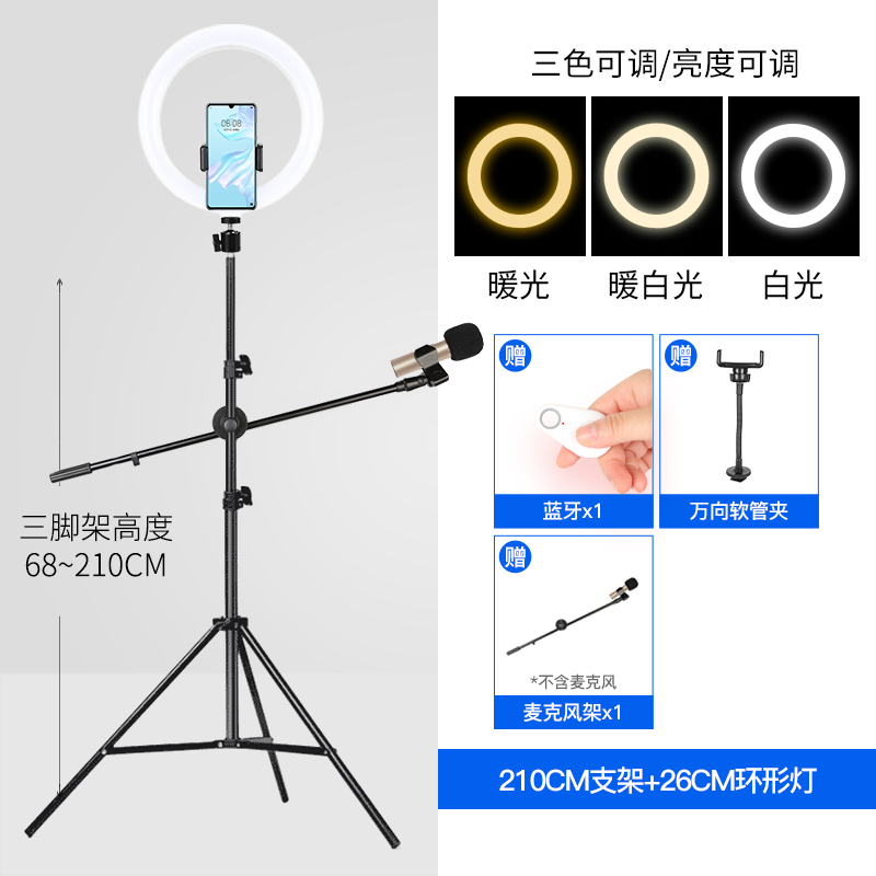 • 210CM 삼각대 + 26CM 필 라이트 + 범용 호스 클램프 + 고정 휴대폰 클램프