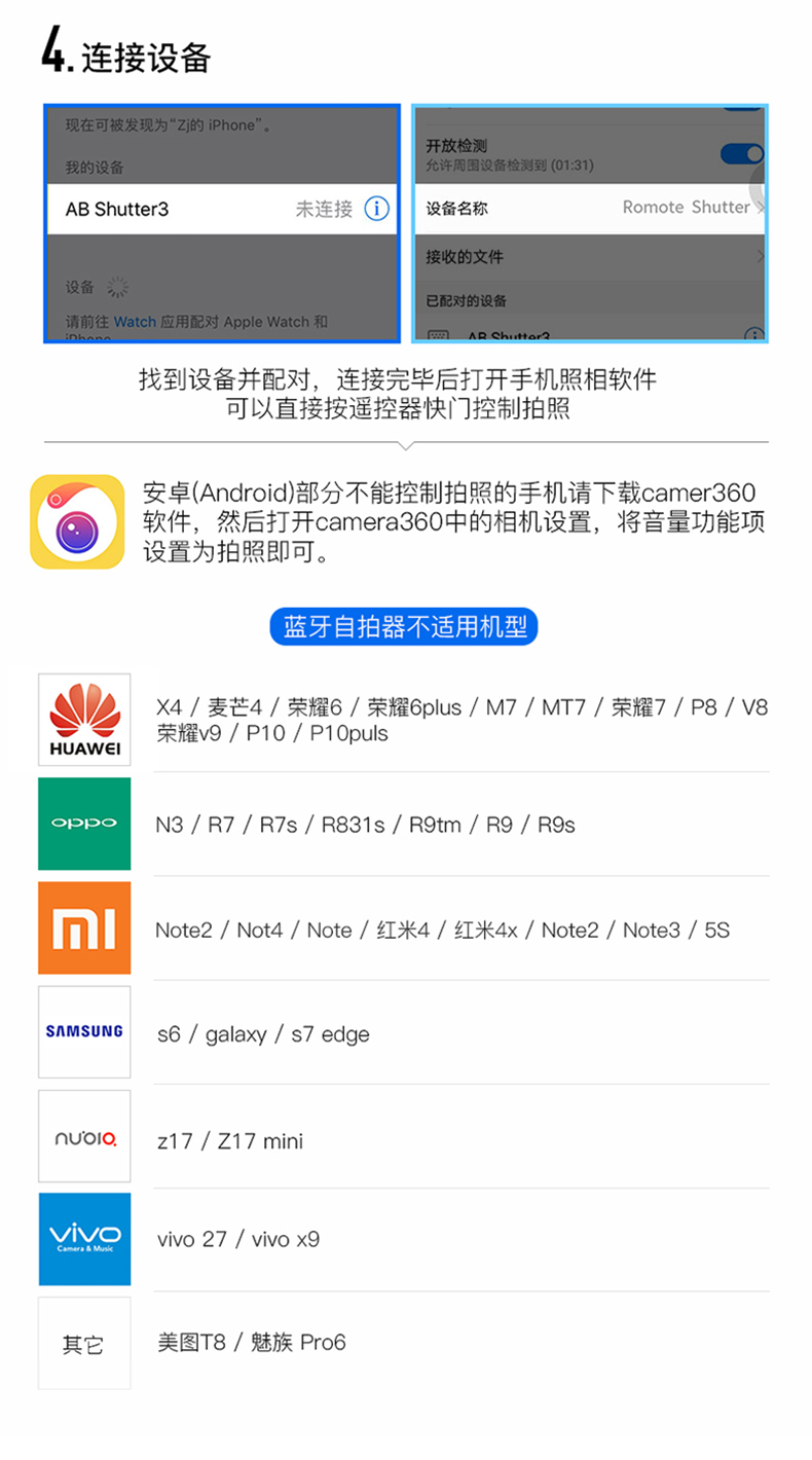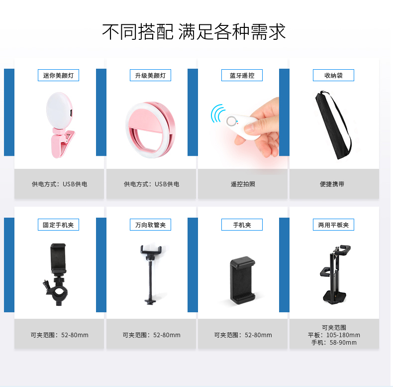 • 170CM 삼각대 + 16CM 필라이트 + 블루투스 셀카 + 휴대폰 클립 + 고정 클립 + 편리함