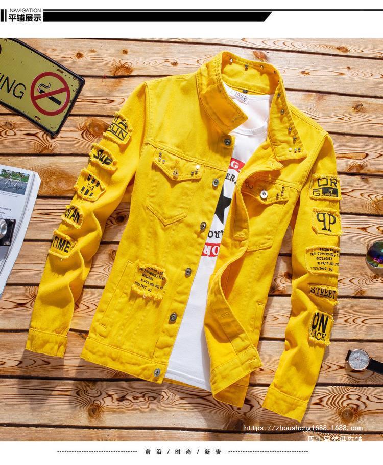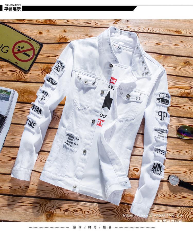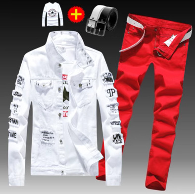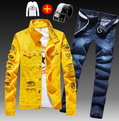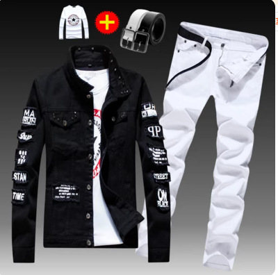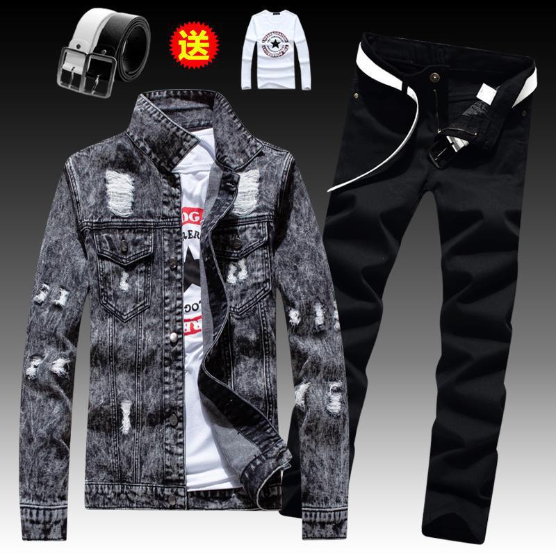 긴 바지를 입은 봄 가을 남자 데님 자켓 세트 한국 유행 잘 생긴 자켓 남자 무료 배송
