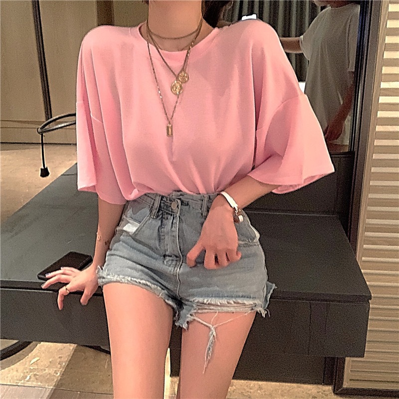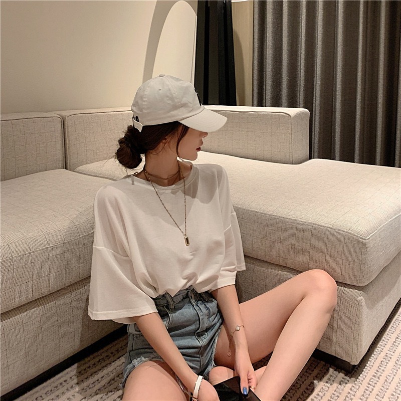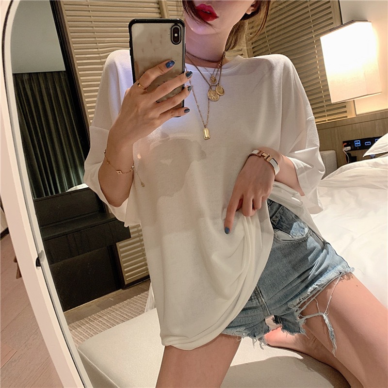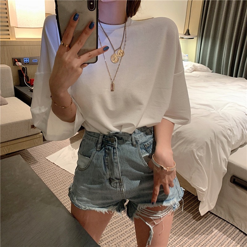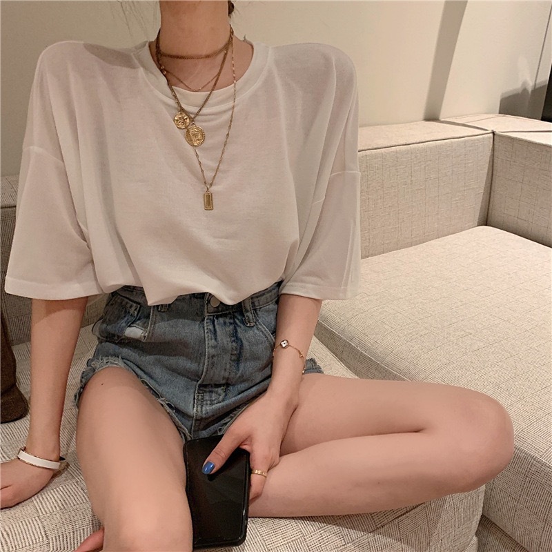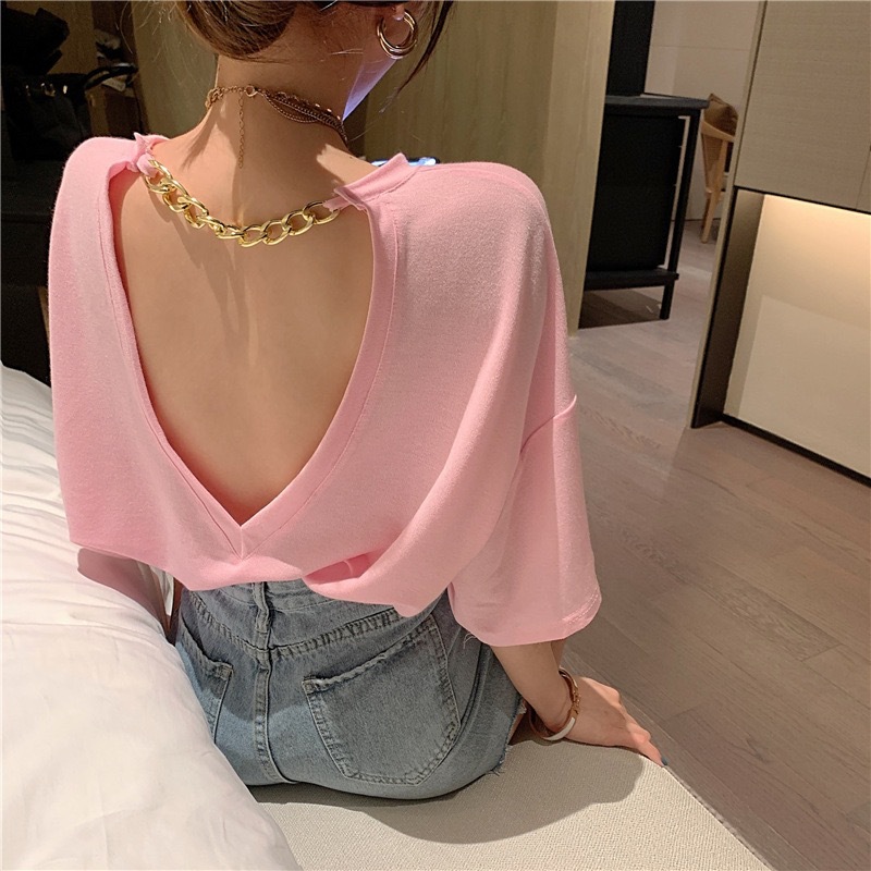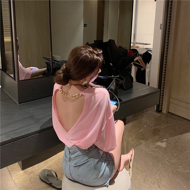 서양식 섹시 백리스 반팔 티셔츠 여성의 여름 느슨한 백 할로우 금속 체인 탑베이스 셔츠 여성용 의류스토어 가기