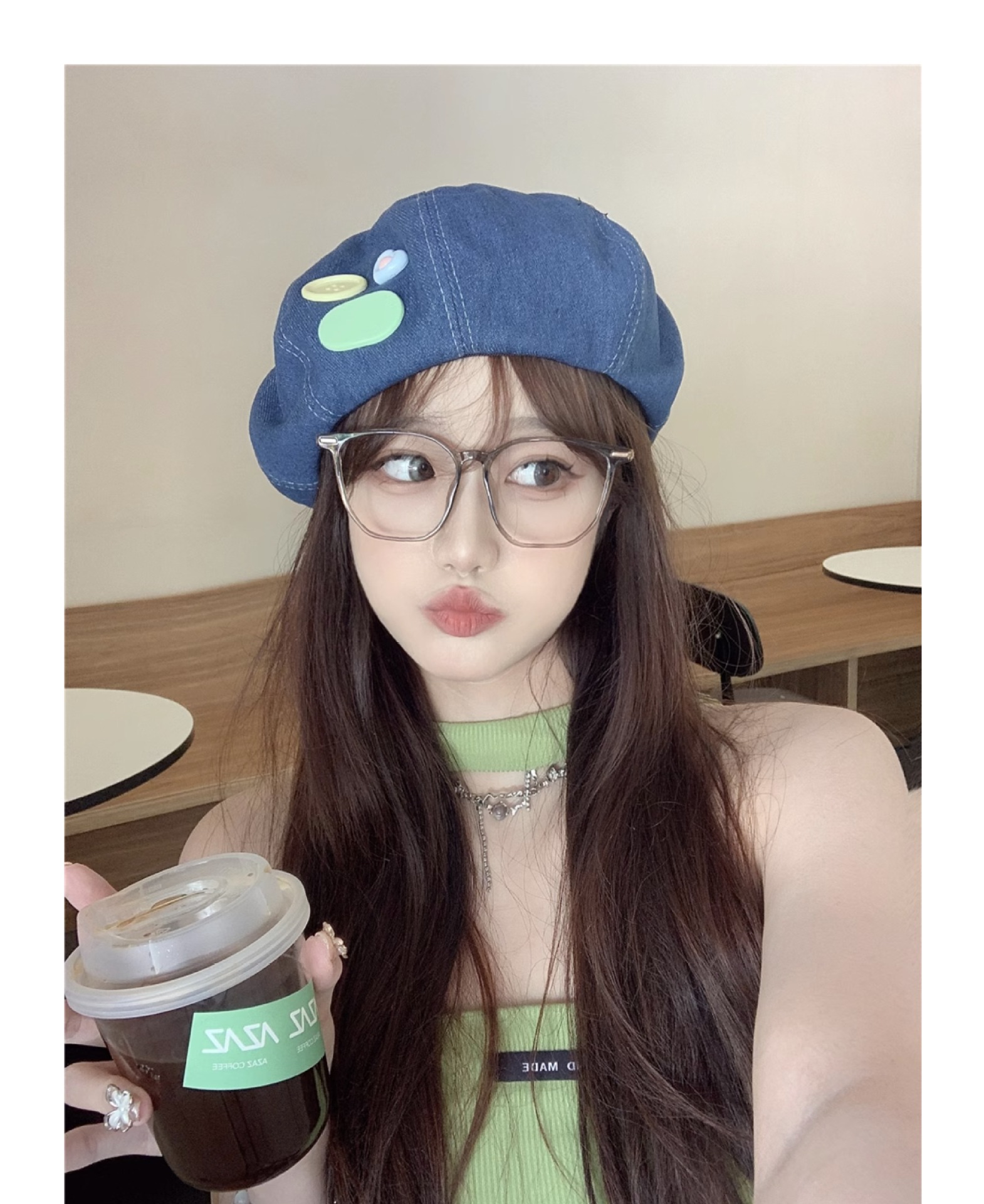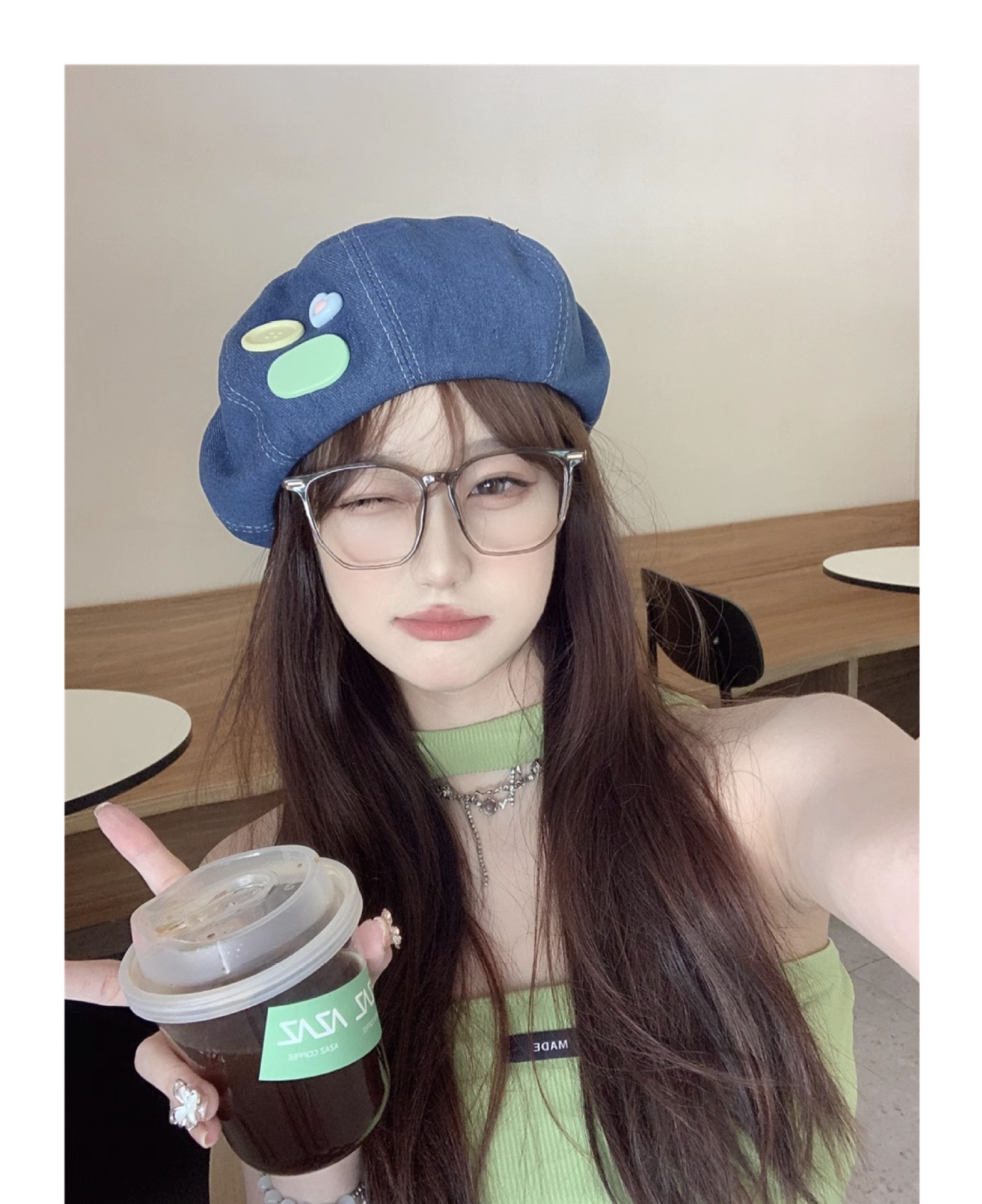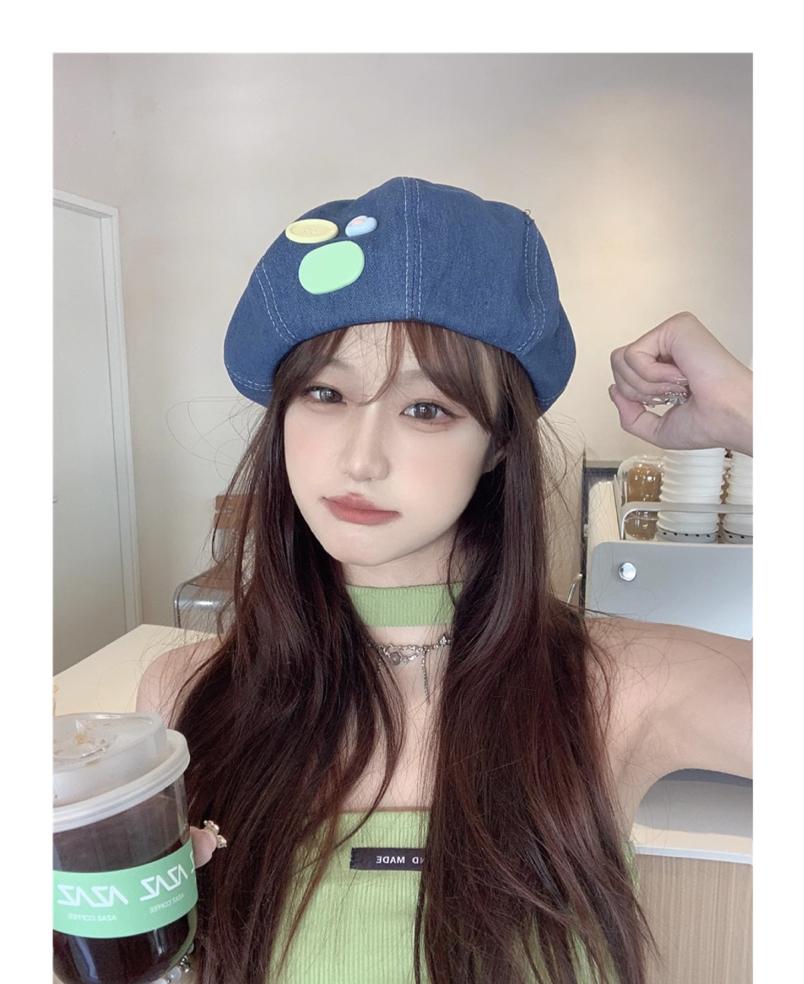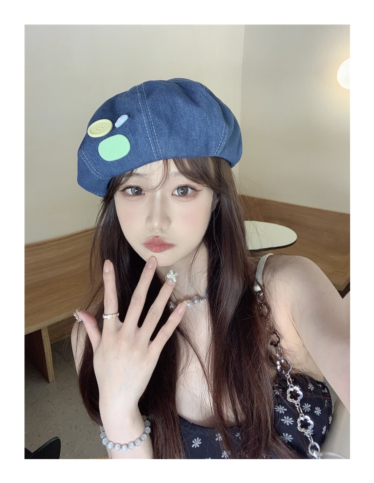 새로운 버튼 디자인 귀여운 베레 여성 일본 패션 올 매치 레트로 데님 팔각형 모자 화가 모자 트렌디스토어 가기