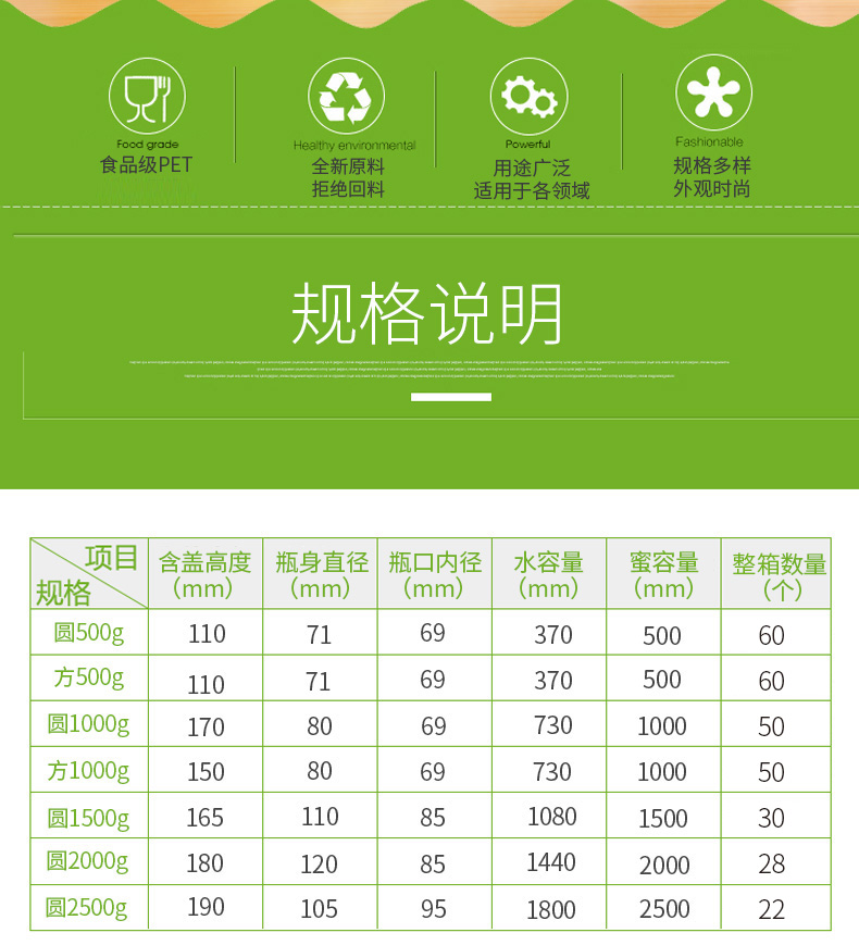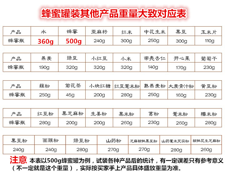 本店所有产品均按照蜂蜜计算的容量,水容量360ml=蜜容量500g,水容量720ml=蜜容量1000g,以此类推。如您装其他物品,下单前请确认好容量或者联系客服,一声不响拍下者,默认发货,因容量引起的问题,概不退换。