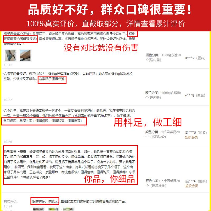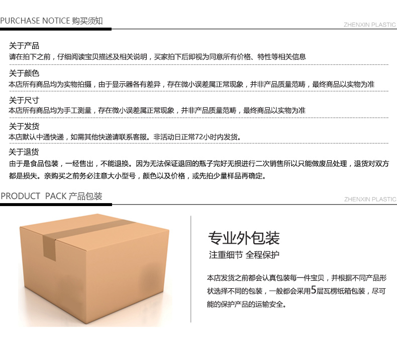 默认发中通快递!新疆、西藏、内蒙、甘肃、青海、海南等偏远地区不发货! 塑料蜂蜜瓶在运输途中避免不了有摩擦 磨花的可能,甚至有压瘪的现象。经常买瓶子的都知道,都能正常使用!快递签收时发现外箱破损或明显的二次封箱情况请拍下照片或者视频发给在线客服处理售后,外箱破损瓶身压坏数量多的包裹请当快递送货员的面拒签退回。如外箱破损签收时没有检查清楚导致的瓶身压坏、变形等售后问题买家自理。