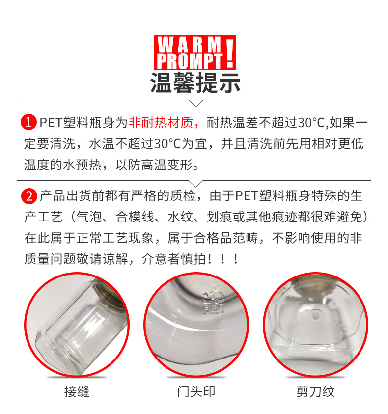 本链接冲量低价销售(普通塑料瓶子只保瓶身不漏水),瓶身有划痕或印记属正常现象,非质量问题都不在售后处理范围,追求的请慎拍哦! 店铺还有其他加厚的瓶子可选,详询客服。