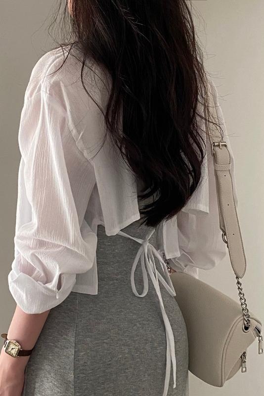한국 세련된 여름 긴 소매 쉬폰 선스크린 셔츠 디자인 센스 돌보는 백 스트랩 백리스 짧은 셔츠