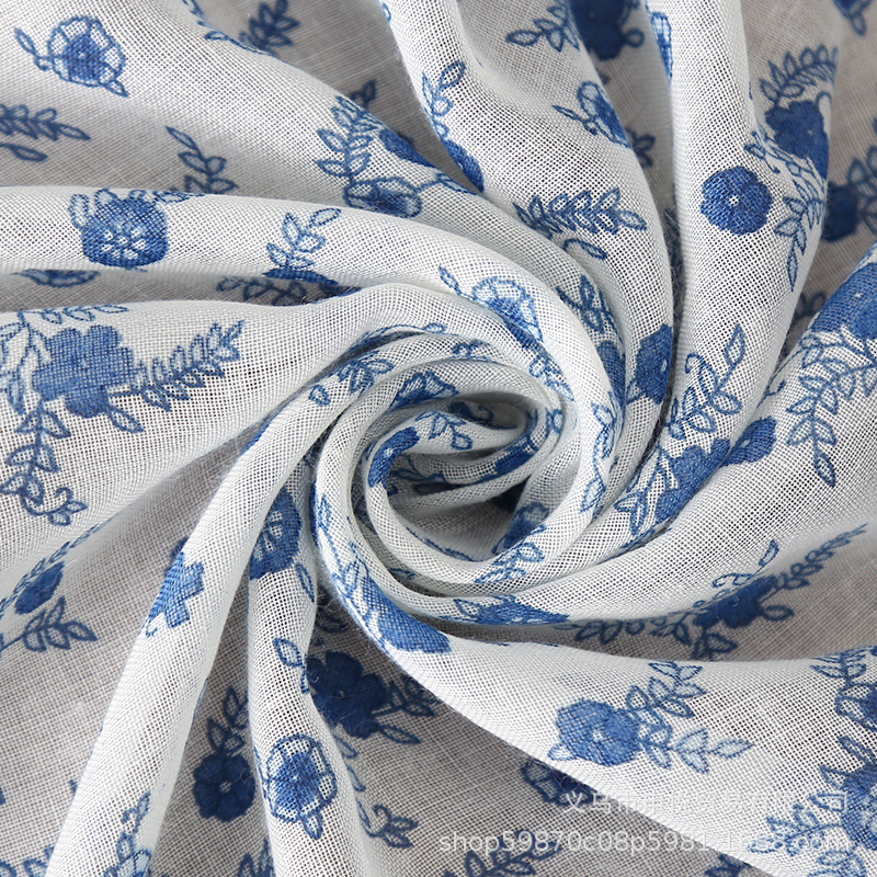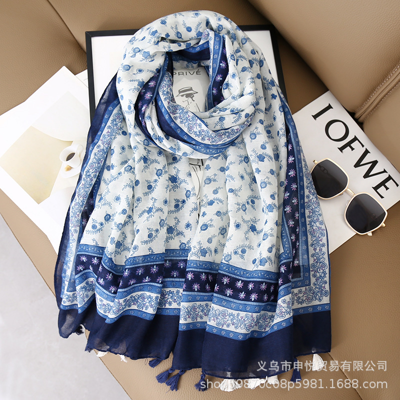 파란색과 흰색 도자기 꽃 패턴 인쇄 스카프 발리 원사 민족 스타일 스카프 여성 올 매치 실크 스카프 면 리넨 따뜻한 목도리