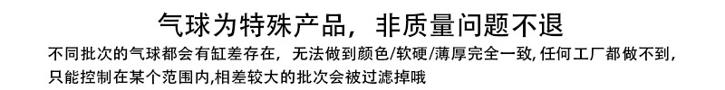 注:气球所在环境不同,反射出来的光泽和颜色深浅也会不同。如室内,室外,阴天,晴天同一种气球的颜色感观上会有些差异。受显示器,照相机等影响,实物与图片颜色会存在轻微差别,不可避免。