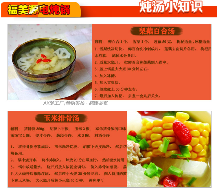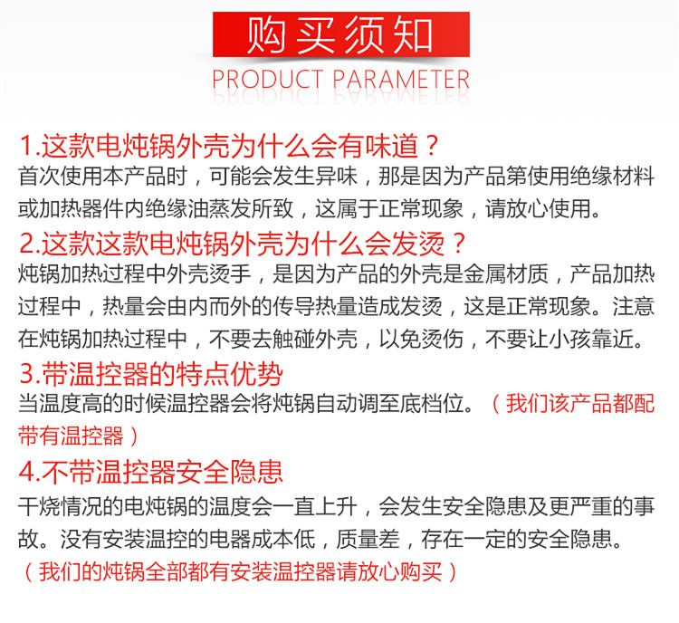 特别提示:电炖锅是采用四周悬空加热技术的,所以使用时外壳发热是正常的。电炖锅是慢炖的、需要提前3小时以上炖