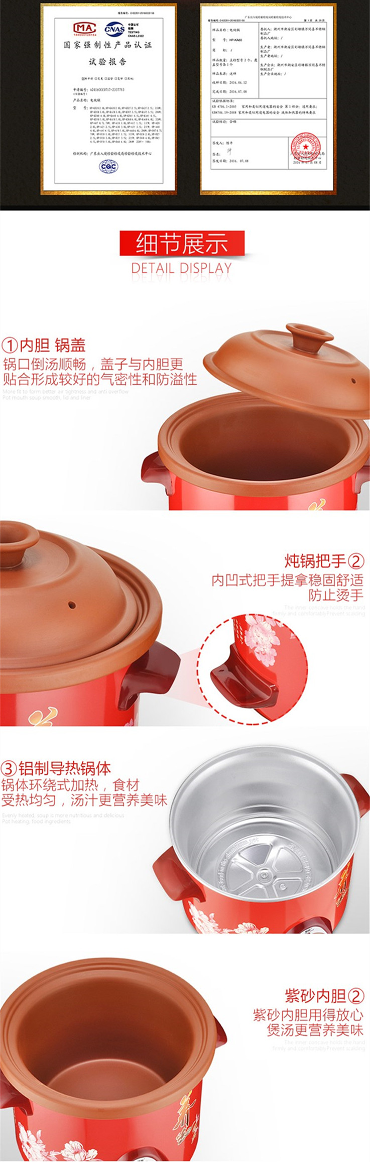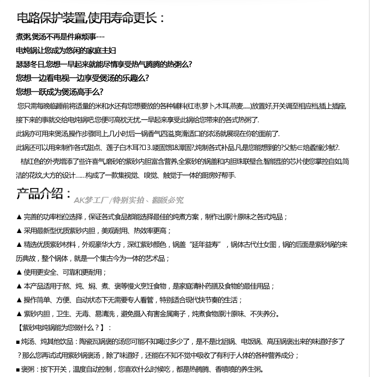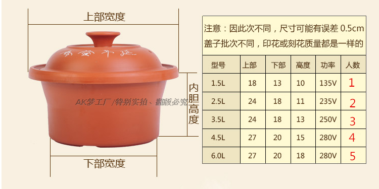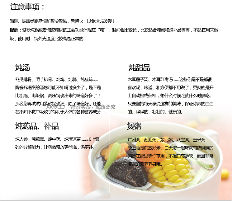 ..紫砂是半手工制作.不像机器制作的每个都光滑。紫砂内胆或者有点粗糙或者轻微瑕疵都是正常的.不同人制作尺寸 颜色 厚度都会有一点误差.紫砂表面粗糙或者有轻微的瑕疵又或者个别的厚度薄些.都是属于正常的.这些问题均不影响正常使用.请勿因为这些避免不了的问题.随意给予中差评.(介意者.请勿拍下!!)拍下前请量好尺寸.以我们的尺寸表为一个参考.尺寸会有误差0.5cm左右.要确认这个误差不影响使用的方可拍下。温馨提示:陶瓷制品不可以直接煤气炉或者明火加热,也不可以当瓷器还有余温的情款下用冷水清洗,也不可以图快,直接加入热水煮东西哦,这样叫做热胀冷缩,会导致陶瓷易碎,或 者爆裂的哦。..........