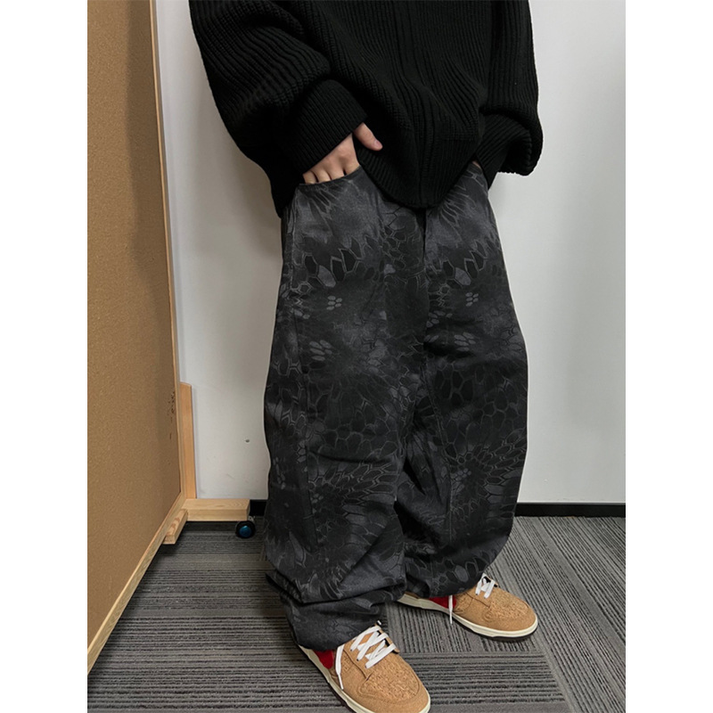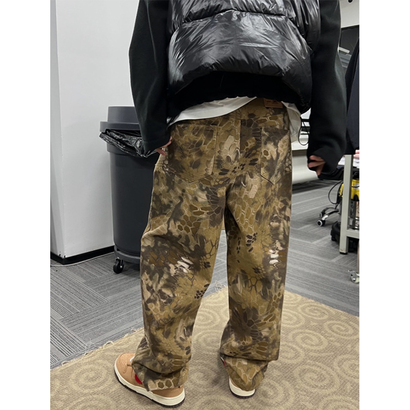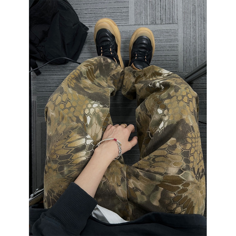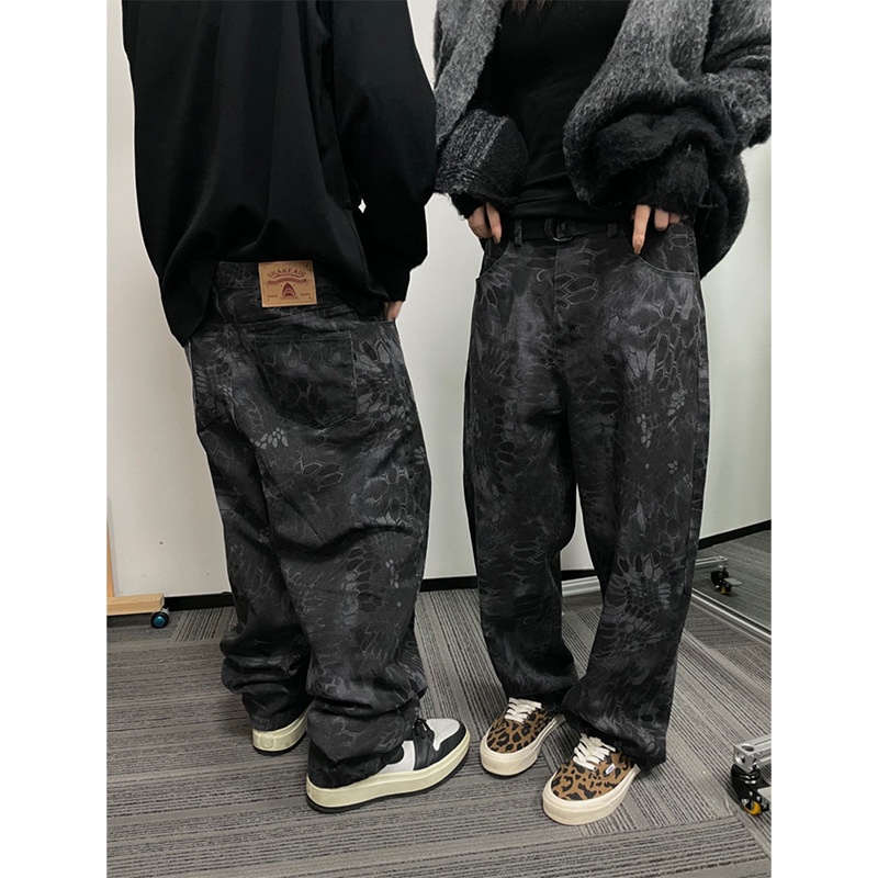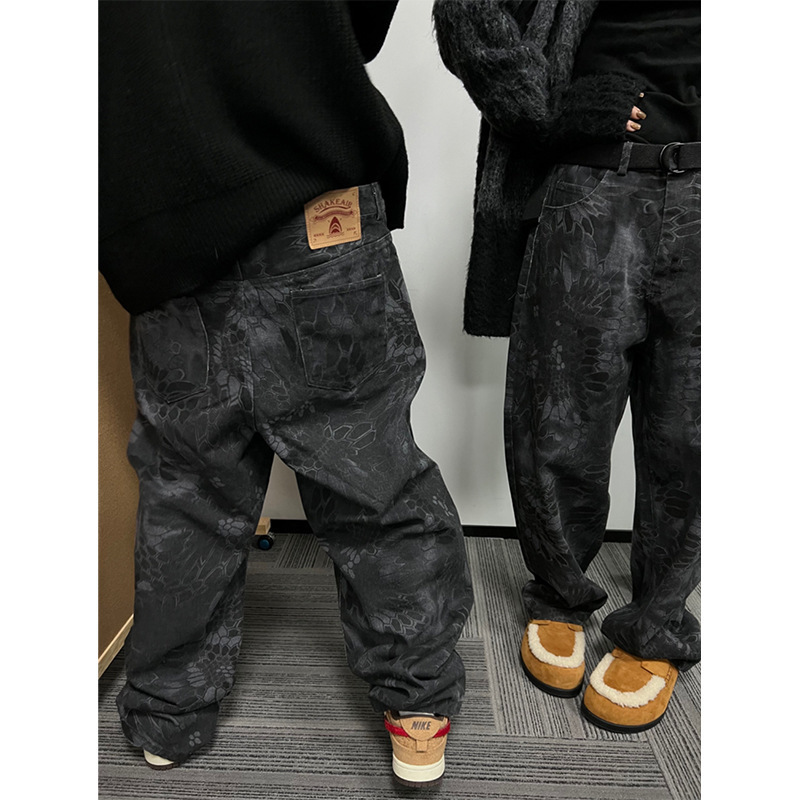 스크랩 어스 스타일 뱀 패턴 위장 청바지 아메리칸 스타일 레트로 유럽과 미국 스타일 바지 빈티지 와이드 레오파드 바지 남성용 트렌디 한 표범 바지
