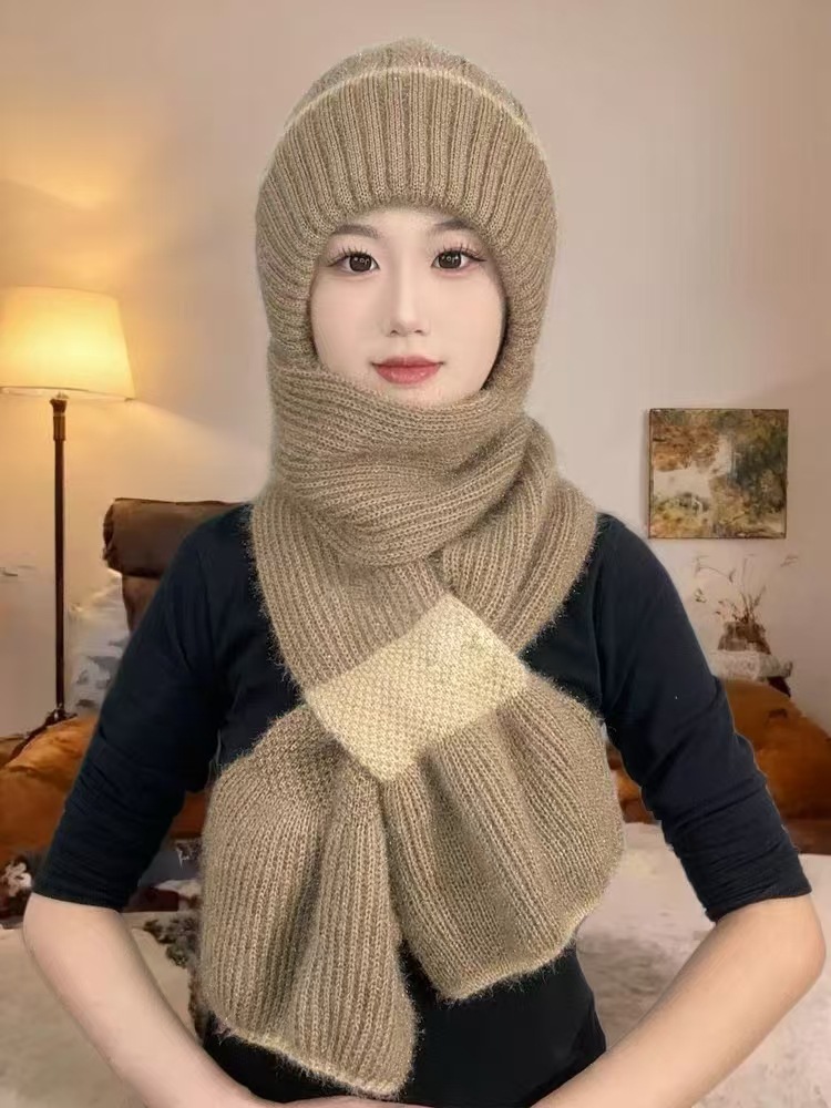 니트 모자와 스카프 일체형 투피스 세트, 보온 및 벨벳 안감, 두꺼운 자전거용 방풍 겨울 모직 모자, 한국 스타일 보온