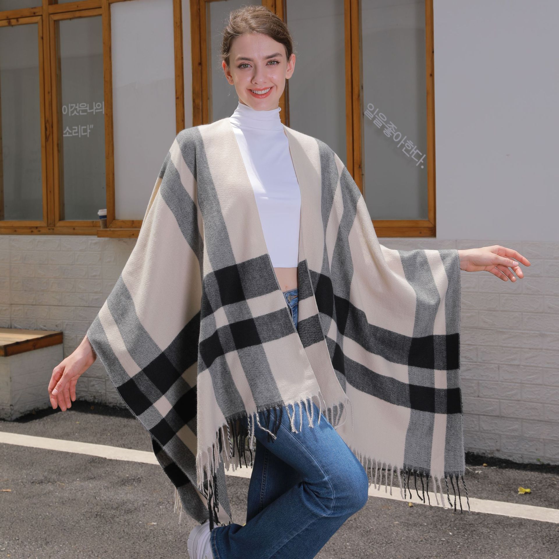 2024 새로운 여성 대외 무역 줄무늬 술 분할 두꺼운 따뜻한 스카프 목도리 케이프 국경 아마존스토어 가기