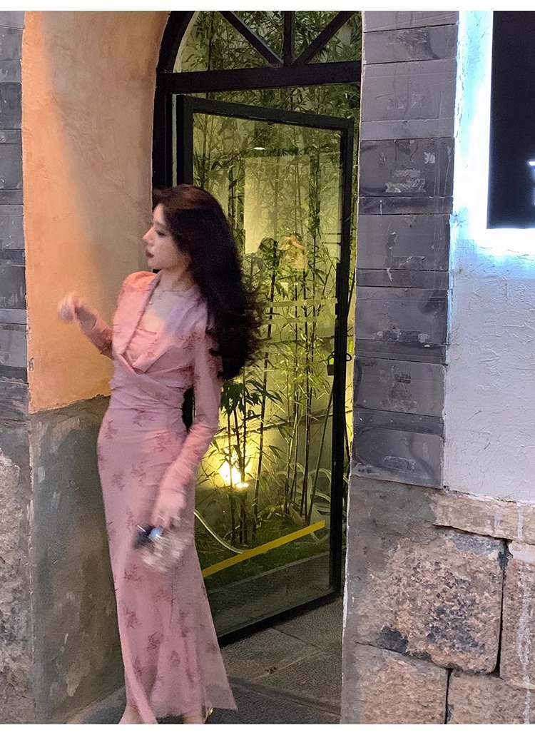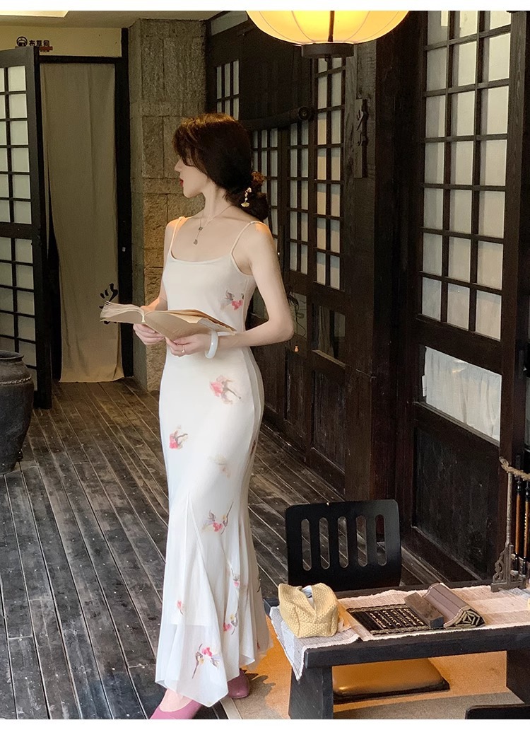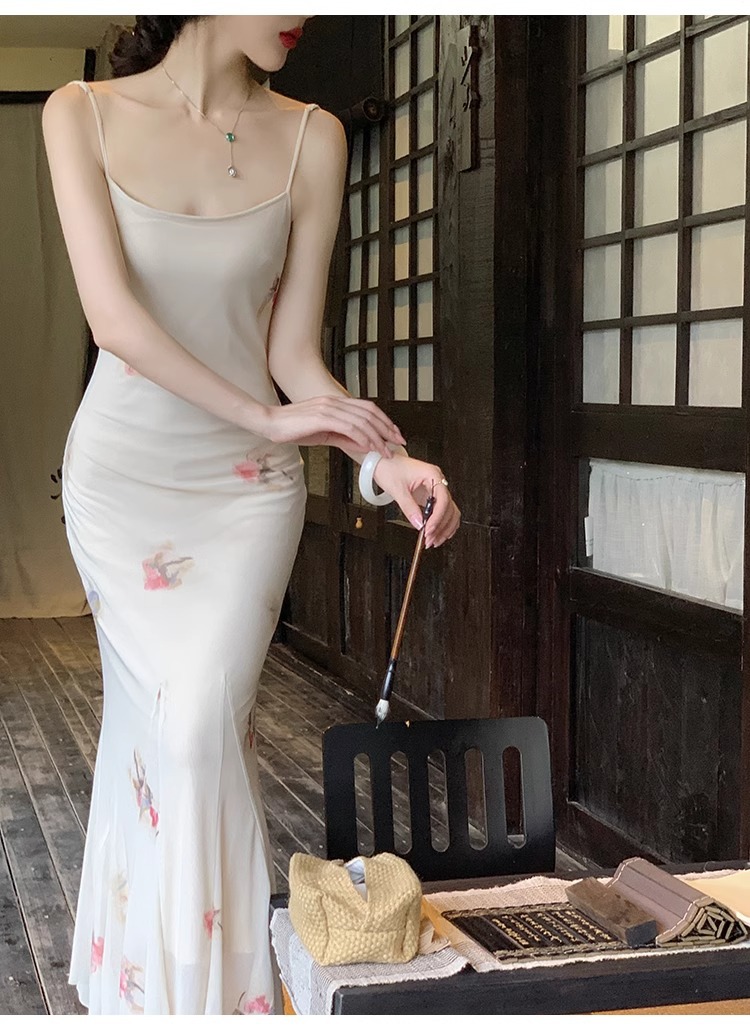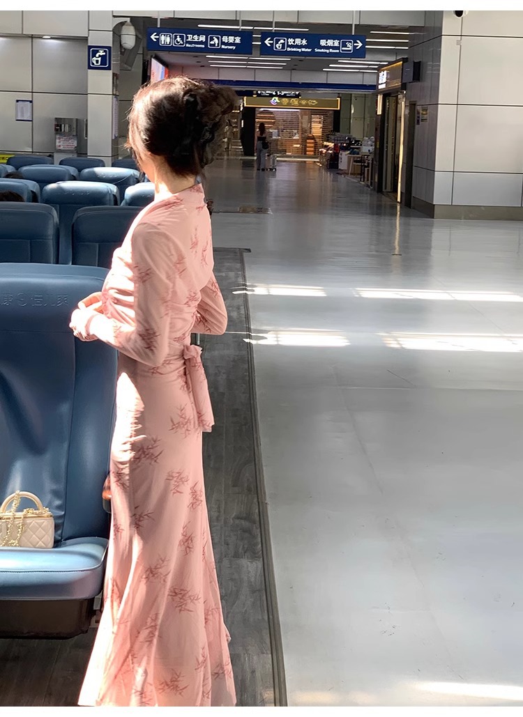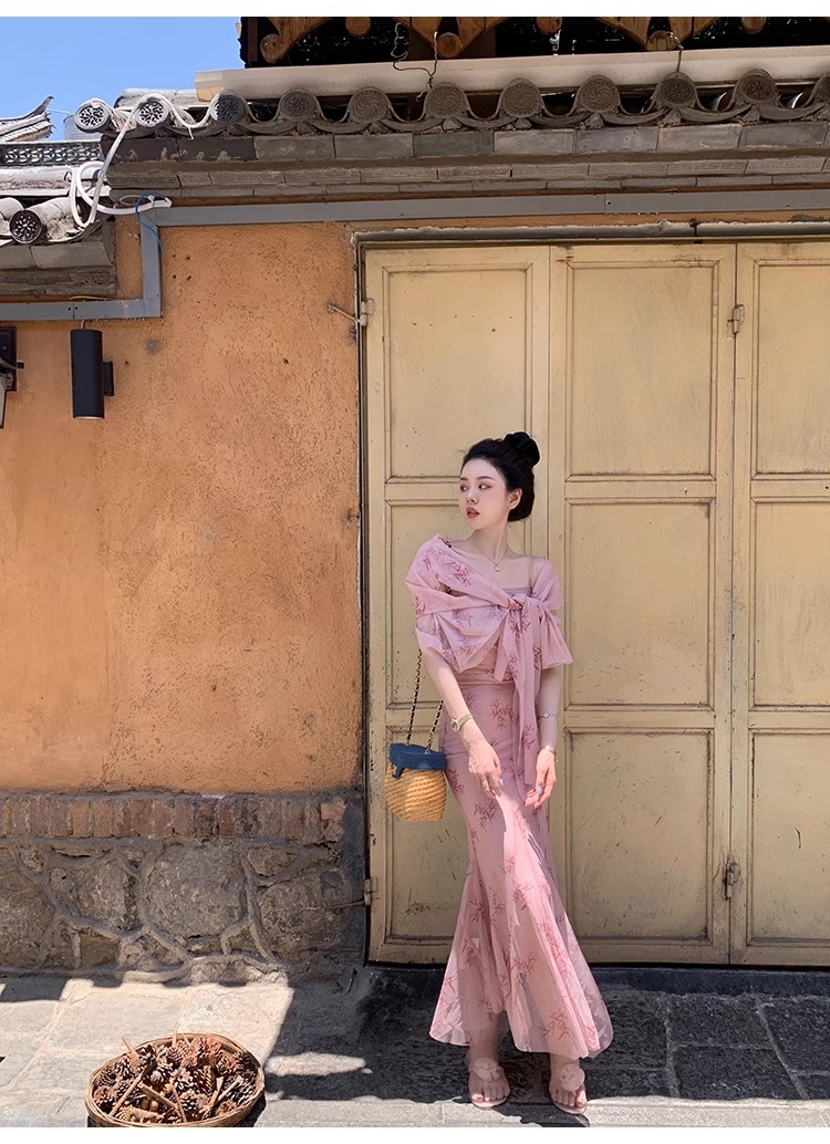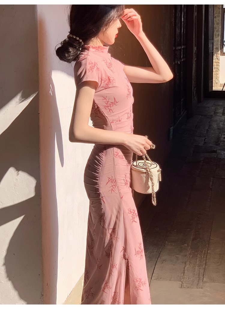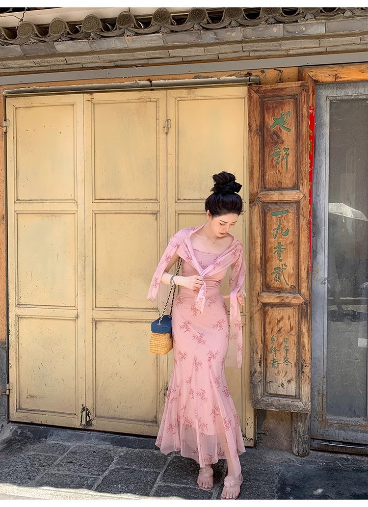 새로운 중국 핑크 꽃 청삼 원피스 우아한 국가 스타일 빈티지 생선 해변 휴가 원피스 투피스 세트스토어 가기