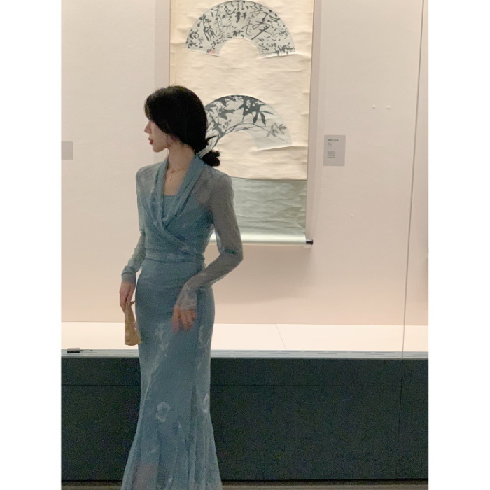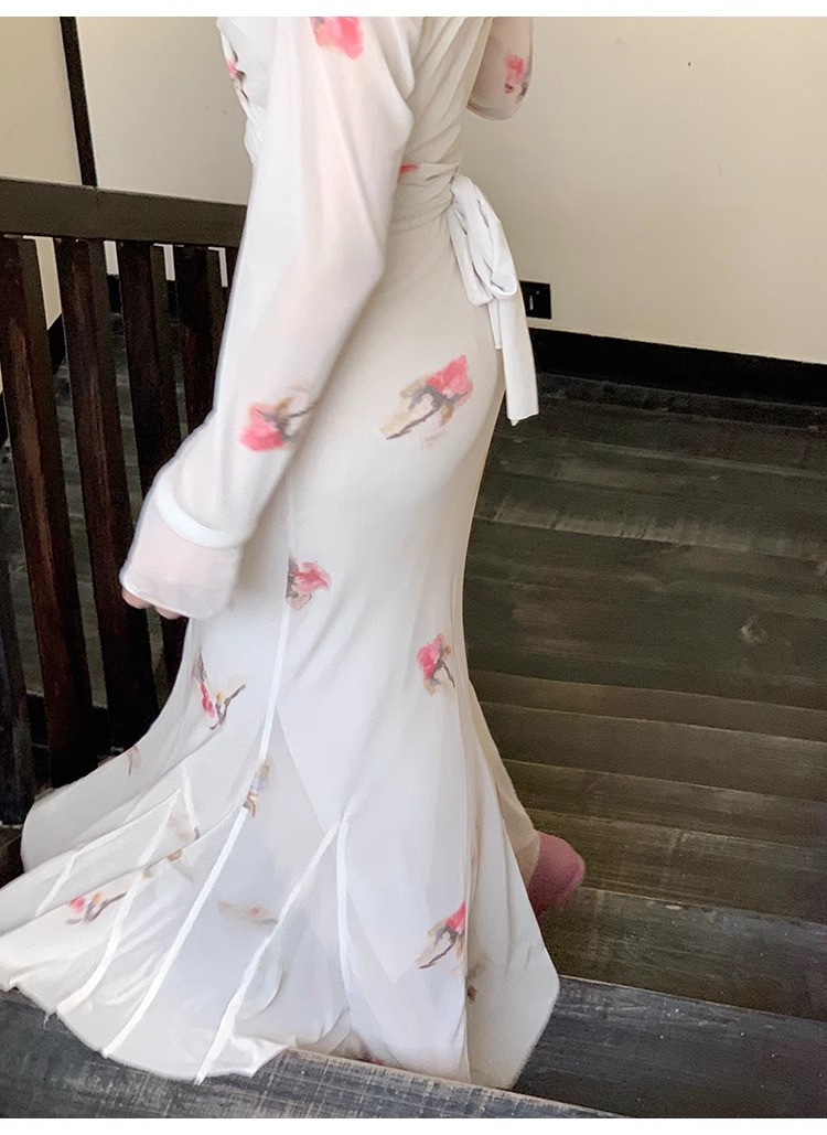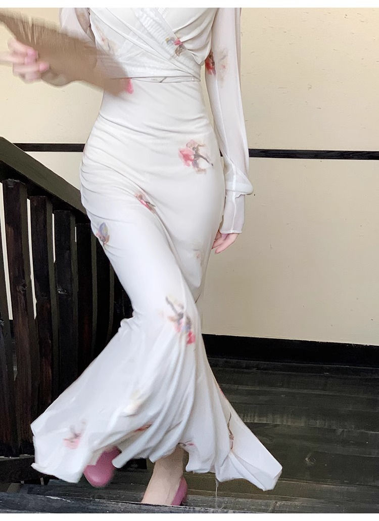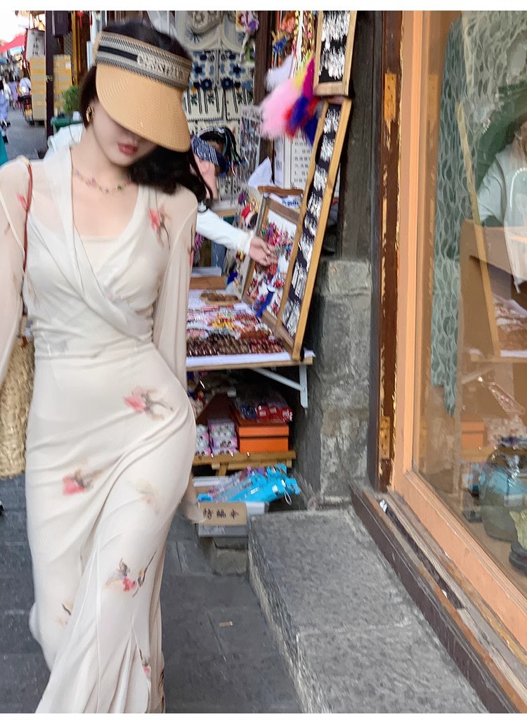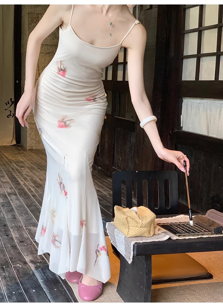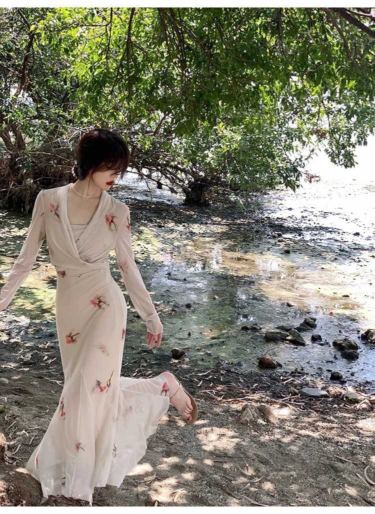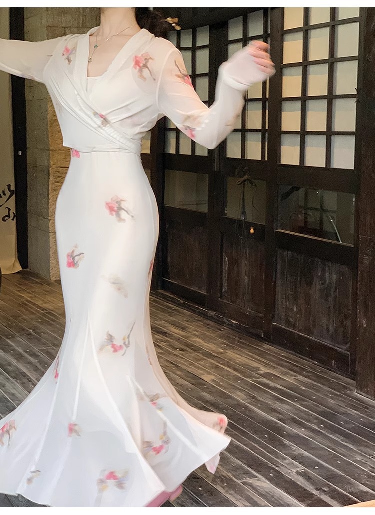 새로운 중국 핑크 꽃 청삼 원피스 우아한 국가 스타일 빈티지 생선 해변 휴가 원피스 투피스 세트스토어 가기