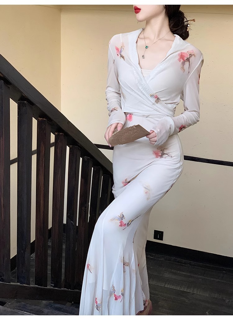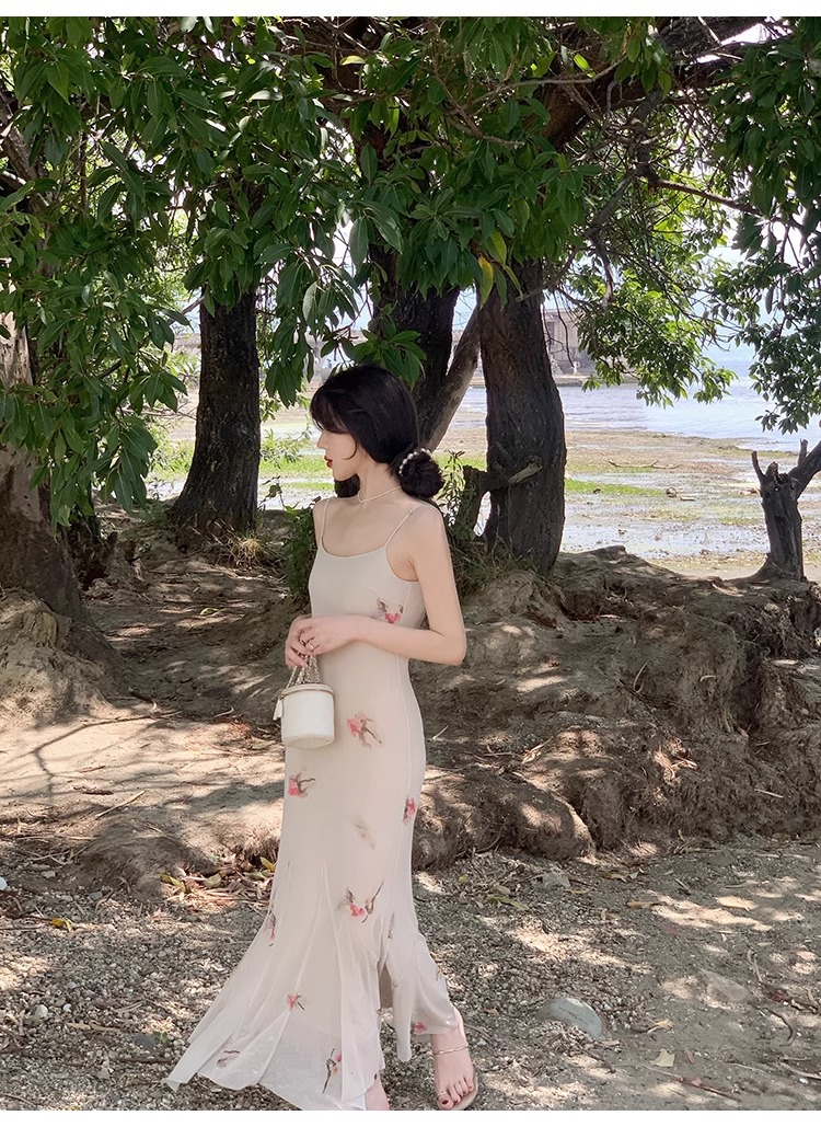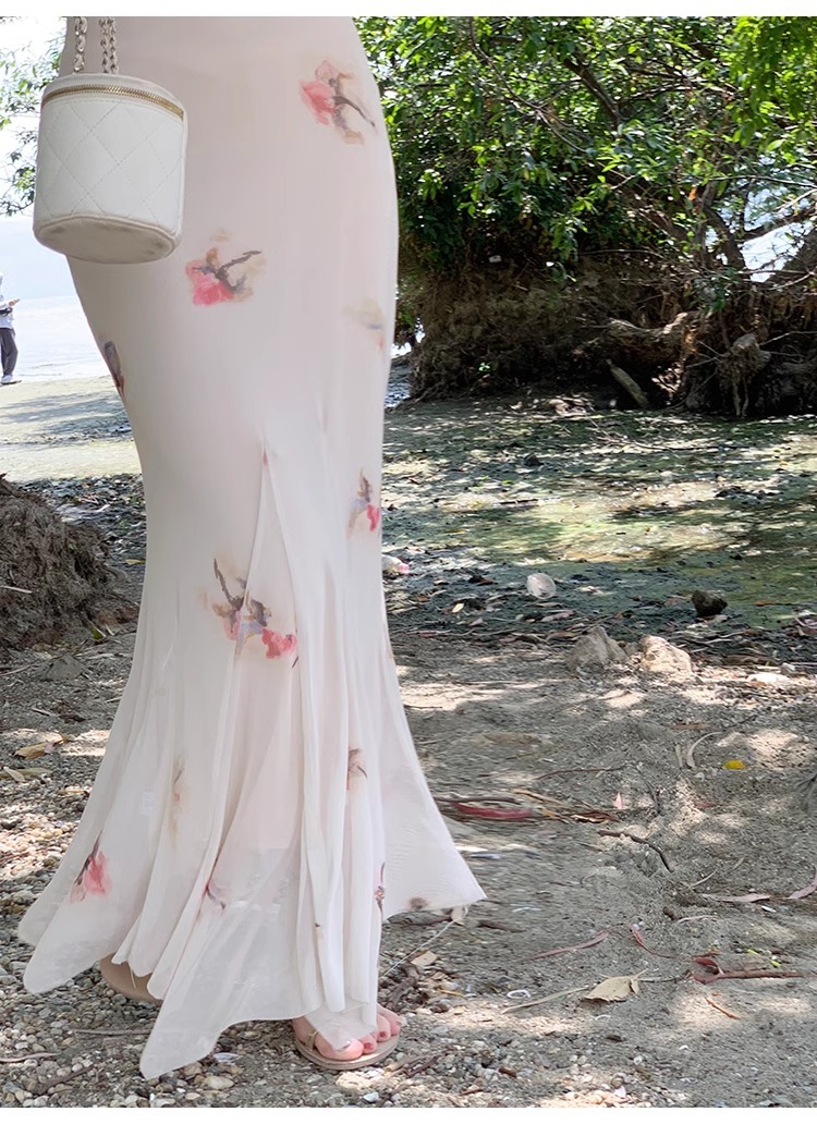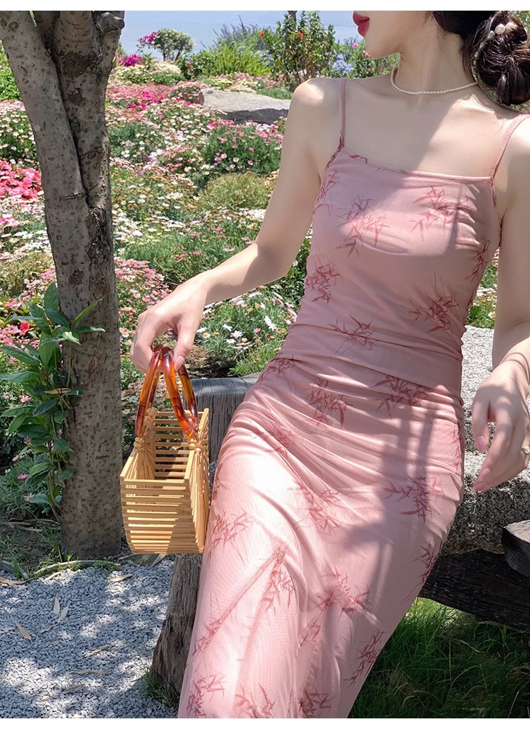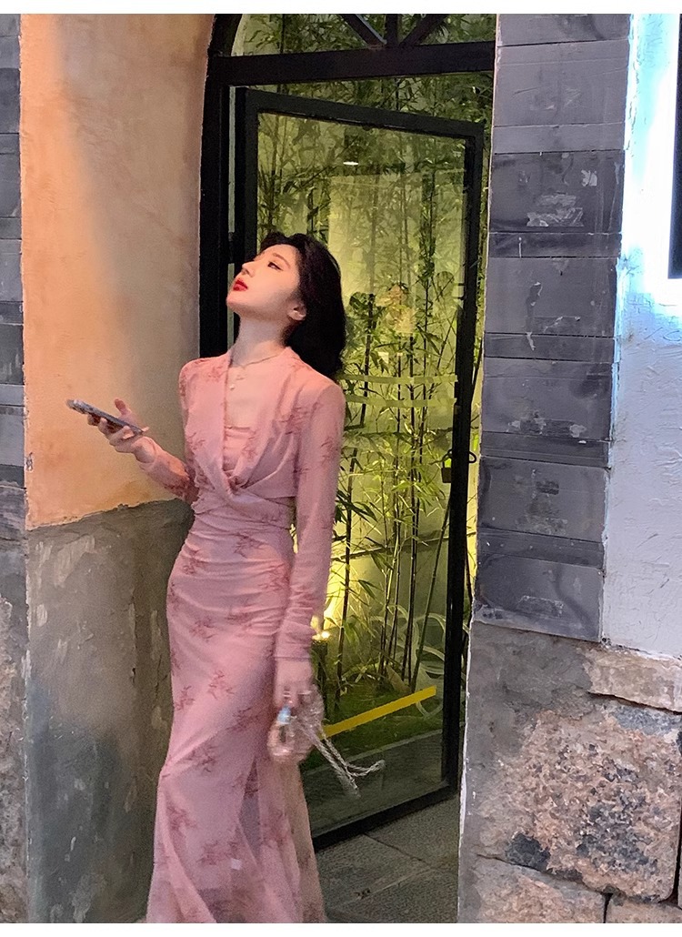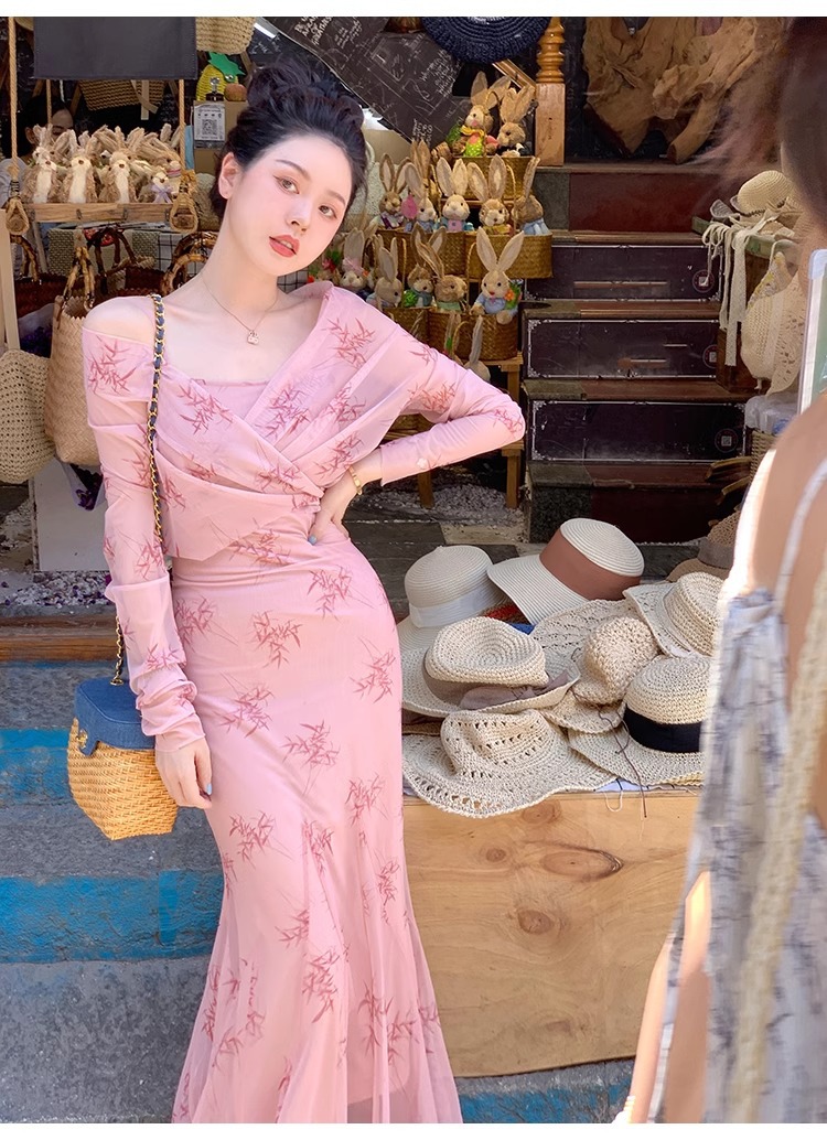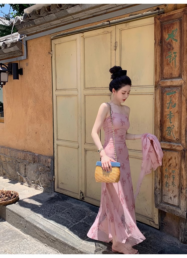 새로운 중국 핑크 꽃 청삼 원피스 우아한 국가 스타일 빈티지 생선 해변 휴가 원피스 투피스 세트