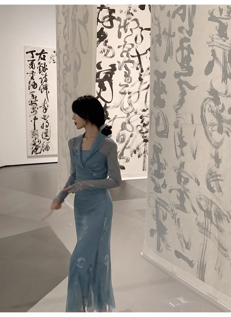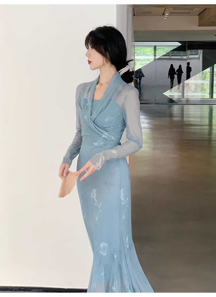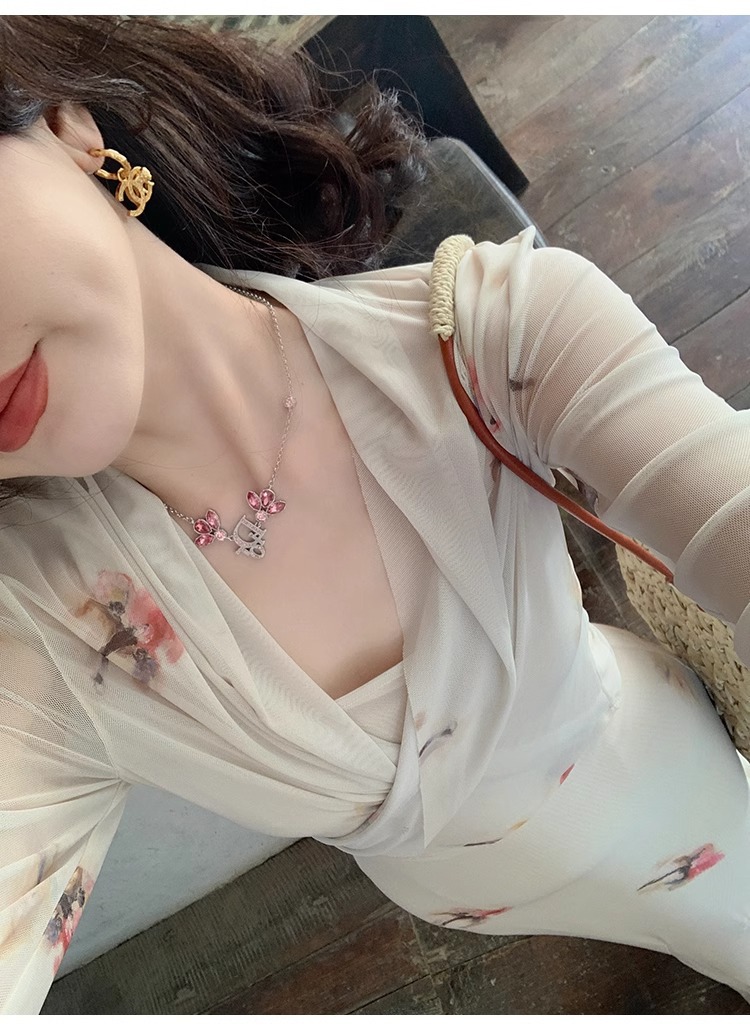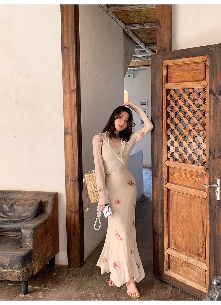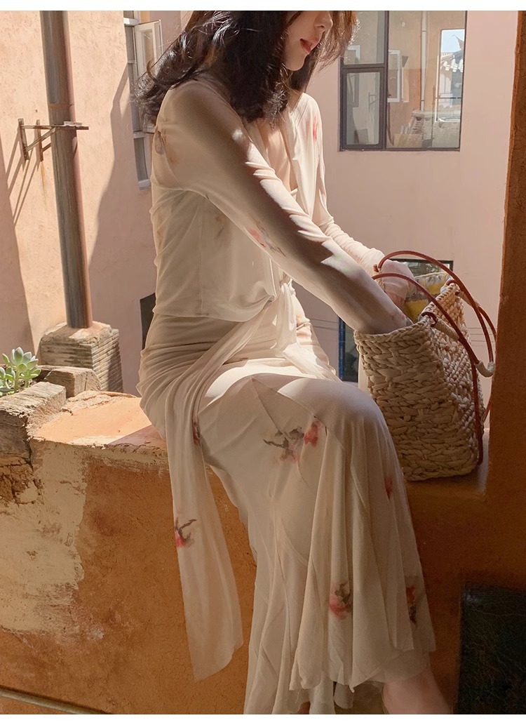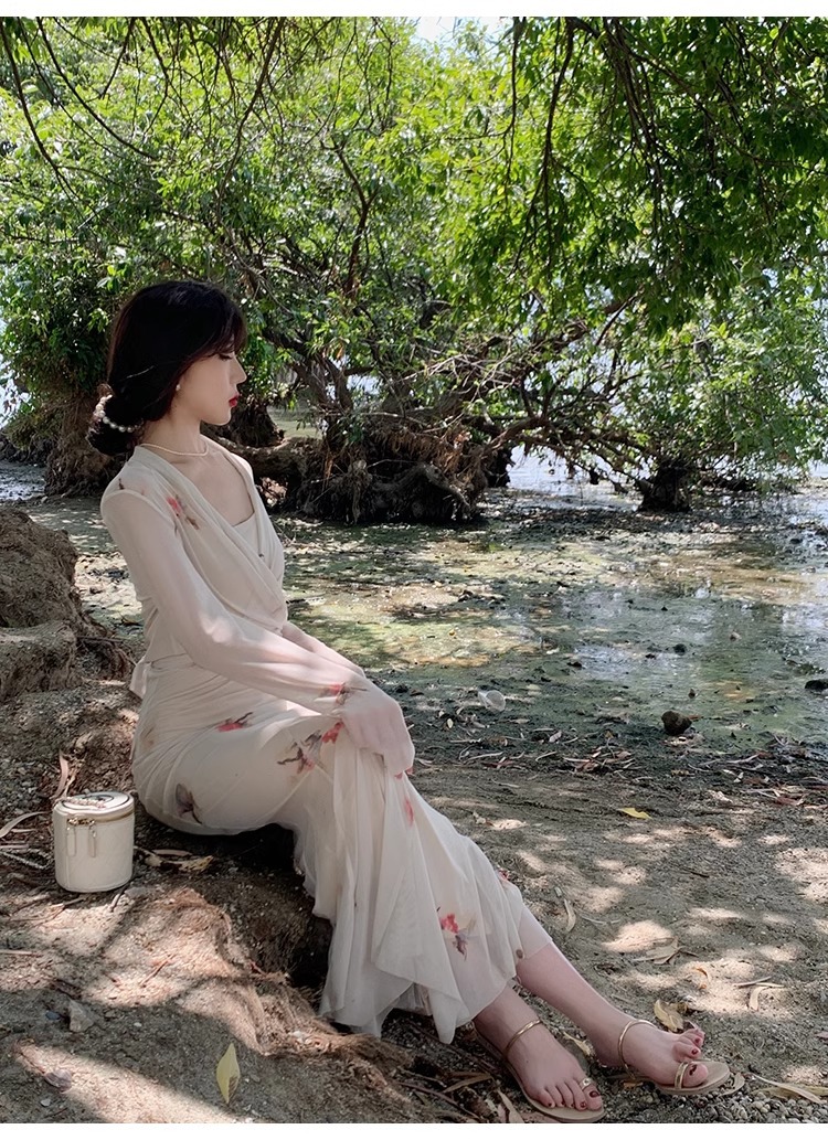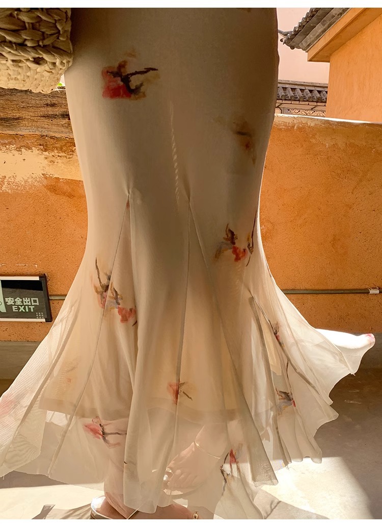새로운 중국 핑크 꽃 청삼 원피스 우아한 국가 스타일 빈티지 생선 해변 휴가 원피스 투피스 세트