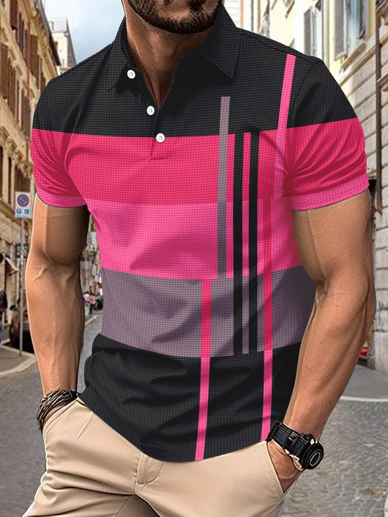 국경 간 아마존, 여름 유럽과 미국의 남성 매일 레저 스트라이프 프린트 옷깃 짧은 소매 폴로 셔츠 소원스토어 가기