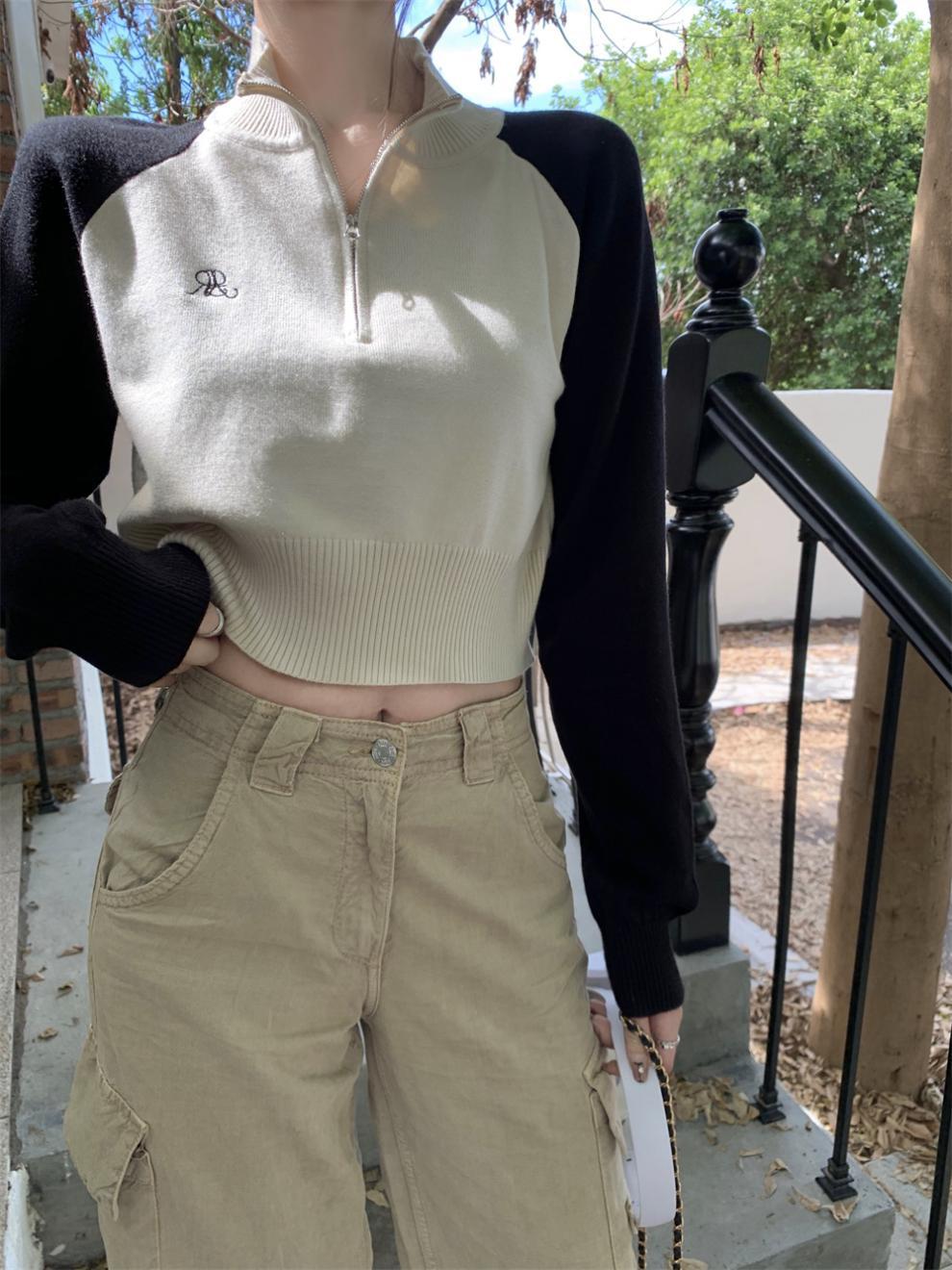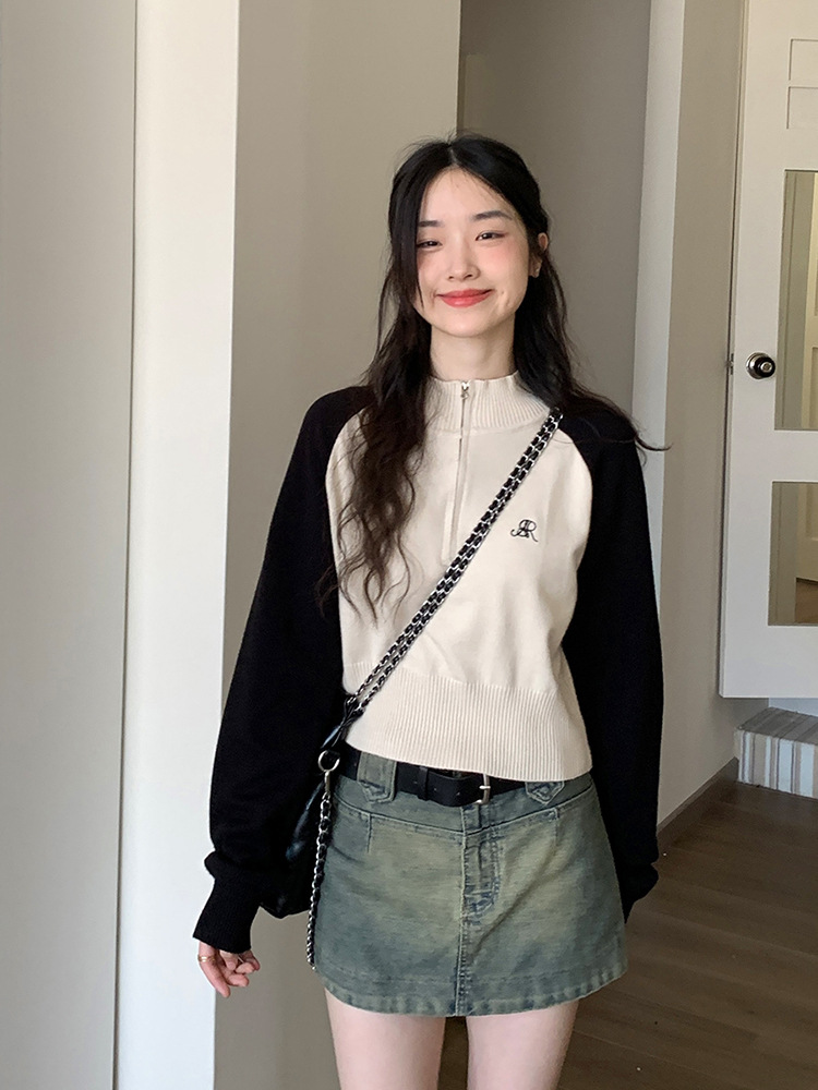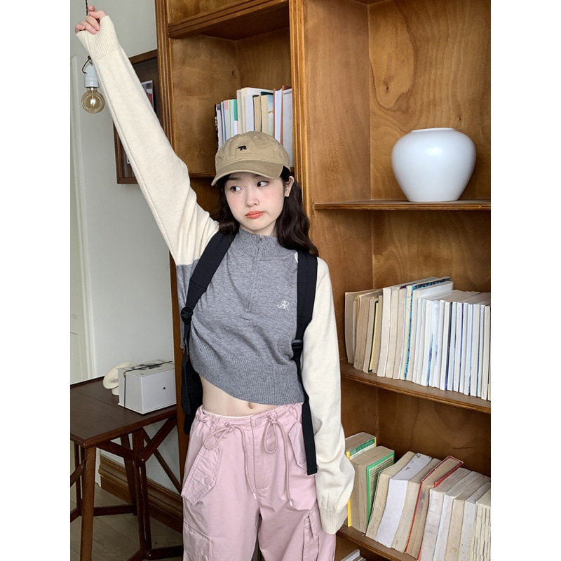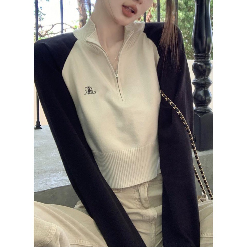 초가을 신상 루샤오투안 투톤 대비 컬러 아카데믹 스타일 니트 한국 디자인 감각 독특하고 다재다능한 여성 상의