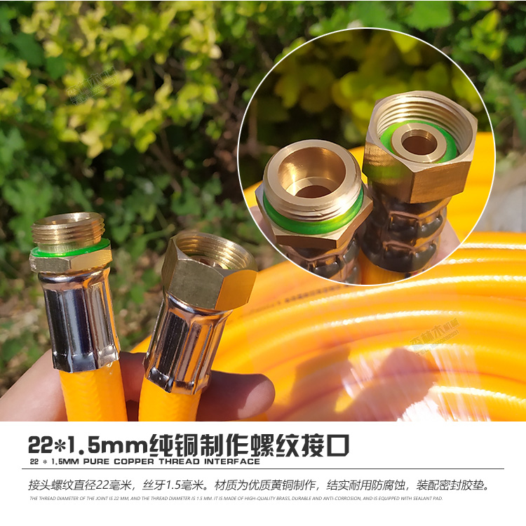 接头螺纹为22mm*1.5高压机用螺纹接口。一般为农用打药机远距离送水或打药主管,施肥等需要大流量的情况下使用。