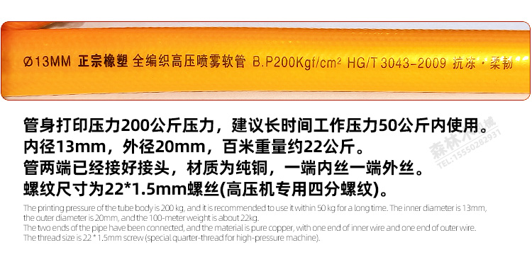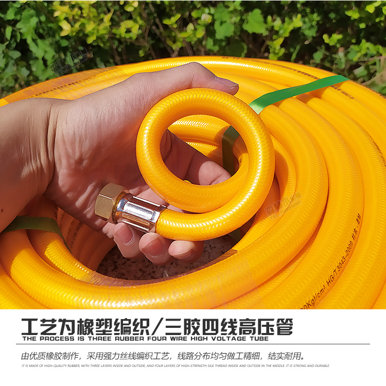 本管为三胶四线高压管,内径约13mm,外径约20mm,工作压力5mpa。