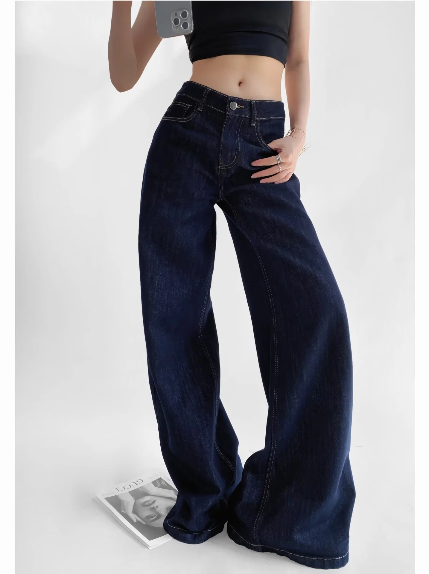 유럽과 미국의 스타일 톤 레트로 낮은 허리 넓은 다리 바지 느슨한 탄성 우아한 올 매치 데님 바지