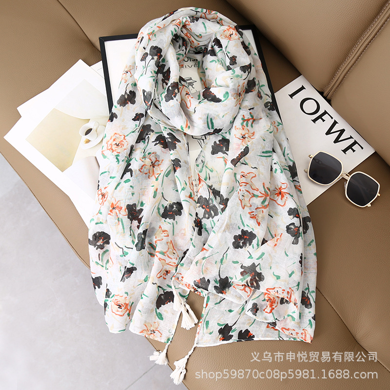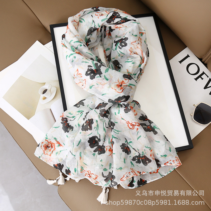 새로운 패션 발리 원사 면 리넨 손 느낌 꽃 인쇄 신선한 통기성 스카프 휴일 선 스크린 얇은 목도리 여성