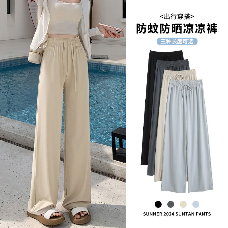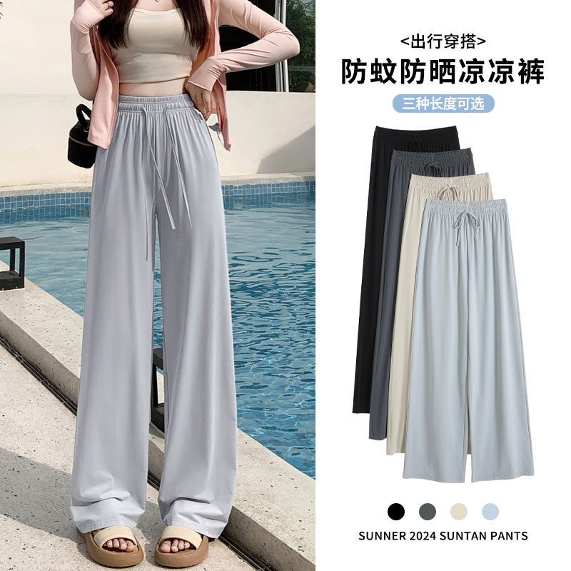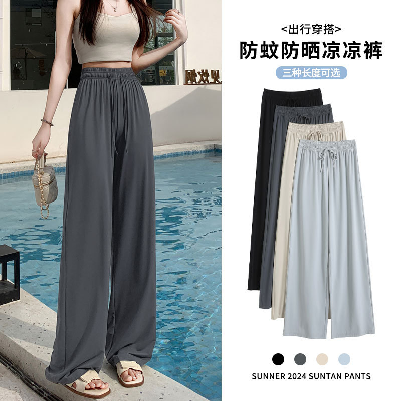 높은 허리 포장 얼음 실크 선 스크린 넓은 다리 바지 여성의 여름 얇은 캐주얼 빠른 건조 쿨 스트레이트 바지 2024 새로운