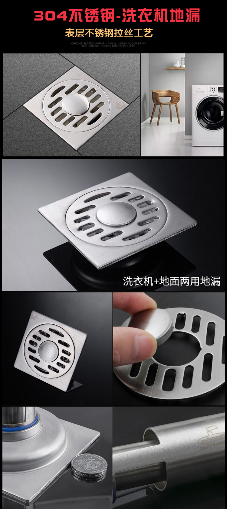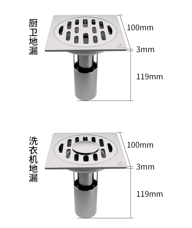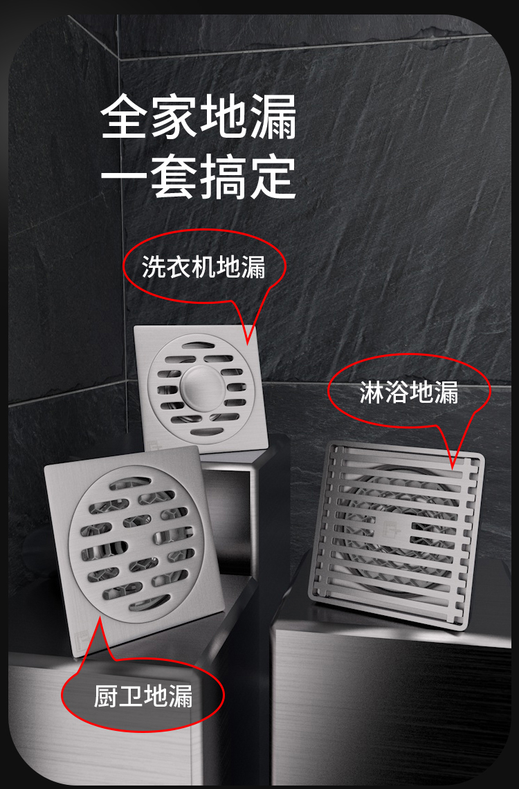 现在市 面上洗衣机排水量大, 建议用全密封款式地漏,可以防止溢水。