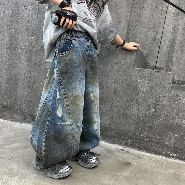 소녀 트렌디 쿨 포시즌 2024 새로운 비방 점진적 변경 편지 반팔 와이드 레그 더티 워시 데님 찢어진 바나나 바지