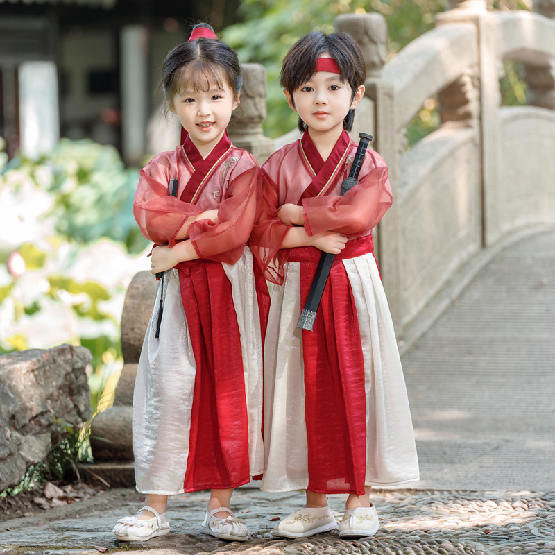 어린이 한푸 소년 탕 세트 새 유치원 소녀 여름 개선 된 중국 스타일 복고풍 공연 의류
