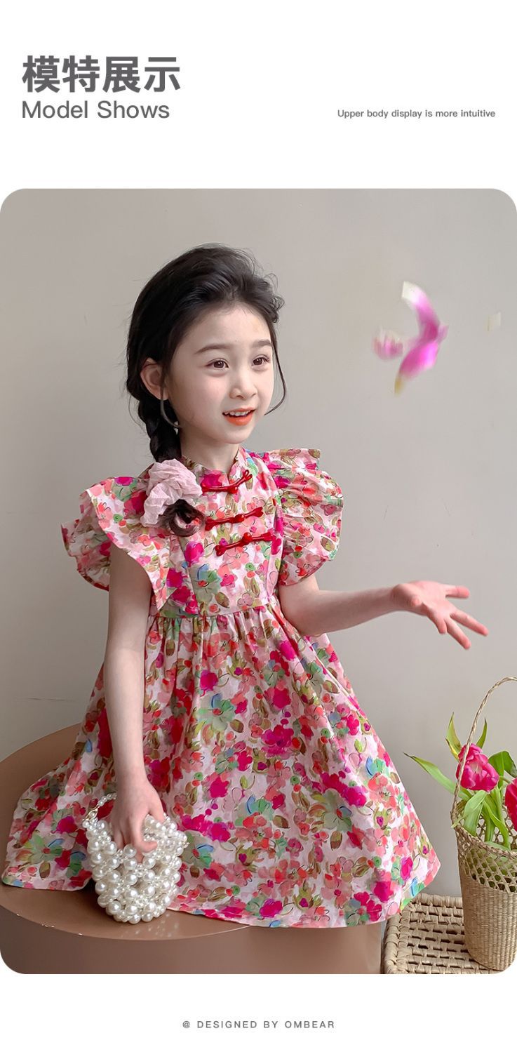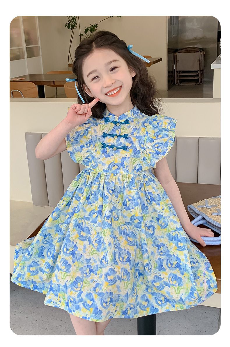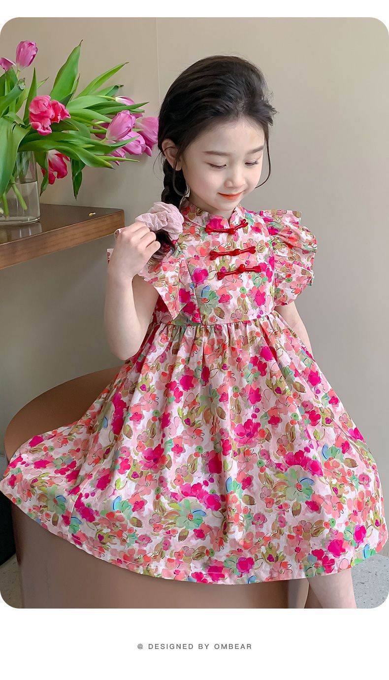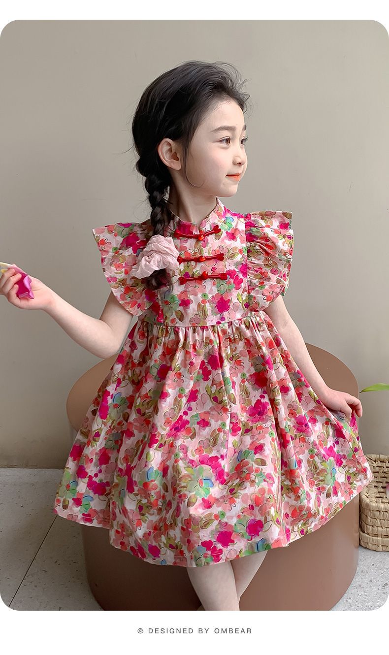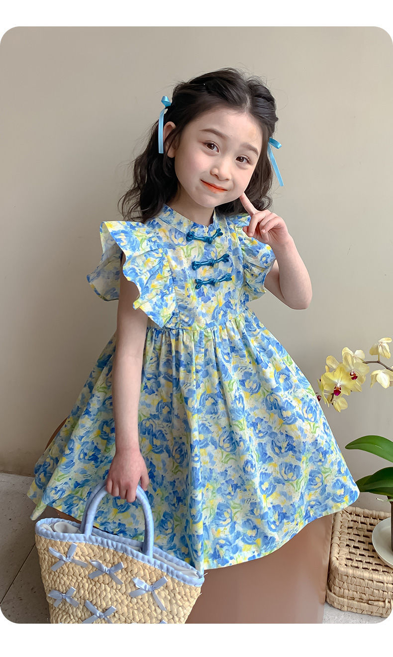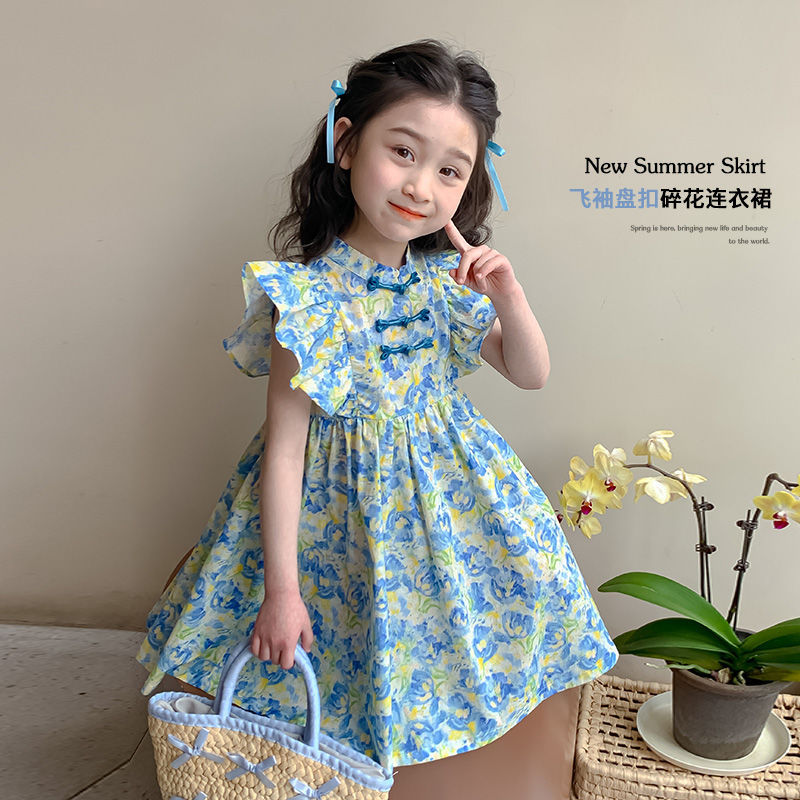 소녀 여름 새로운 유행 중국 스타일 원피스 세련된 작은 비행 소매 어린이 국가 스타일 꽃 공주 원피스스토어 가기