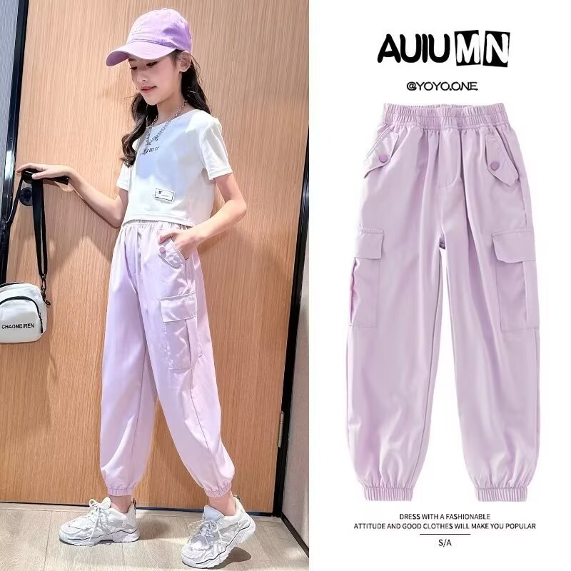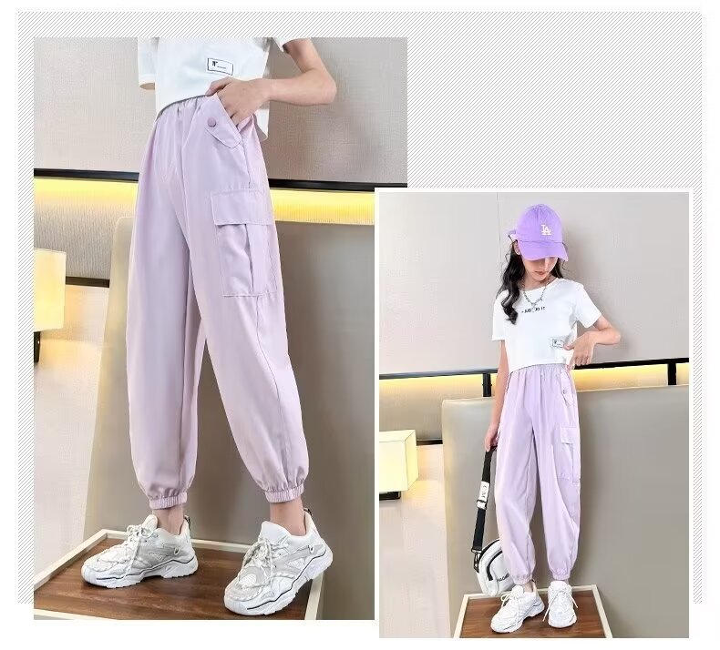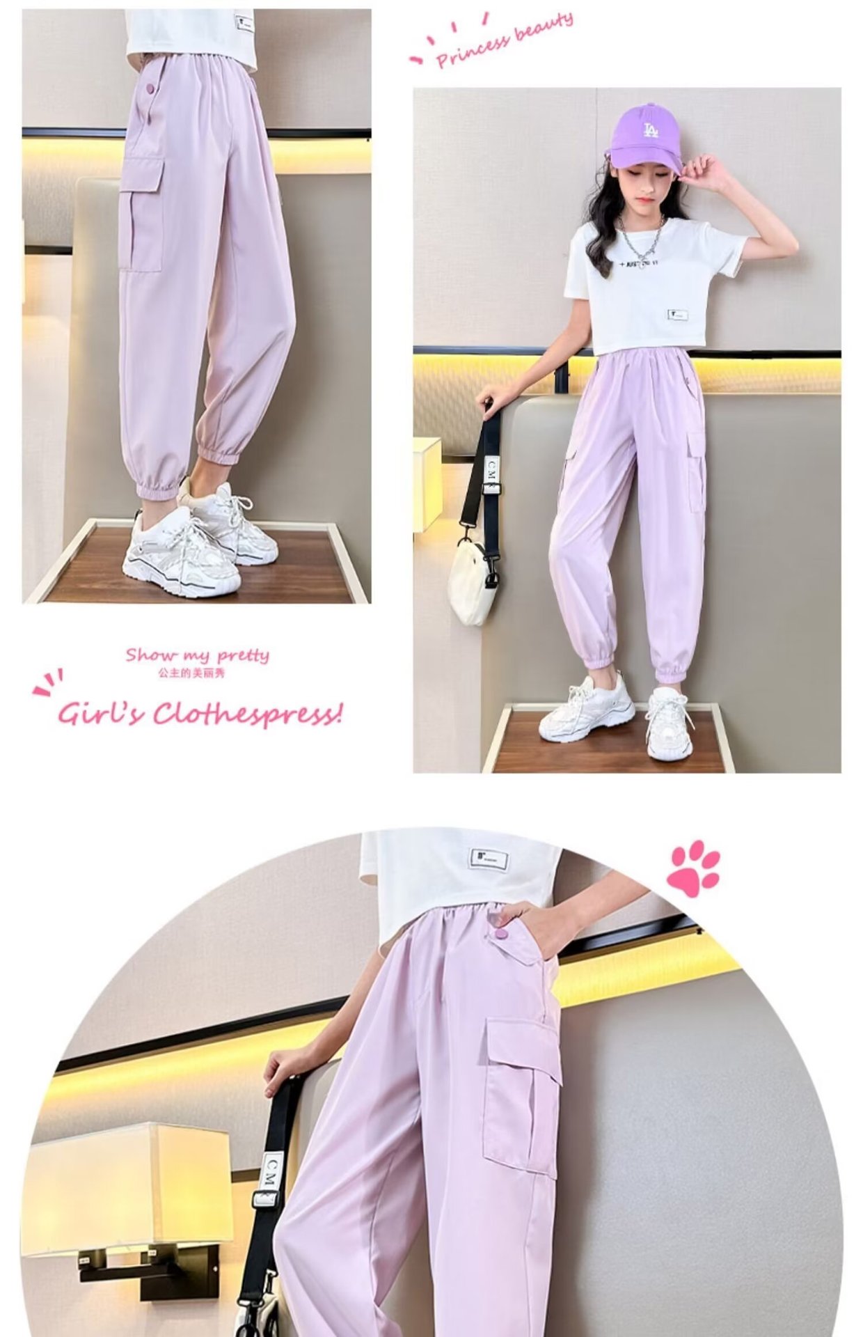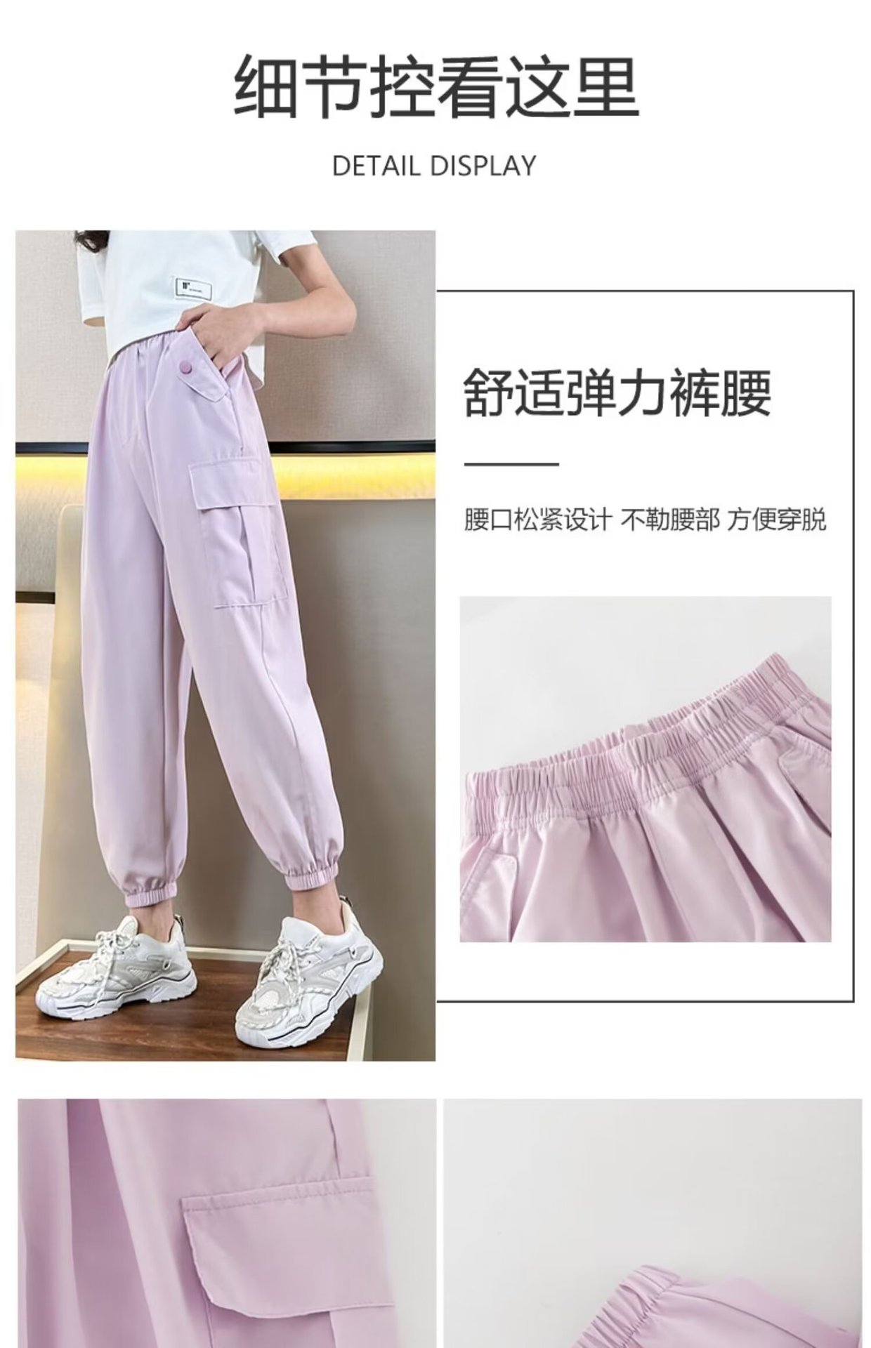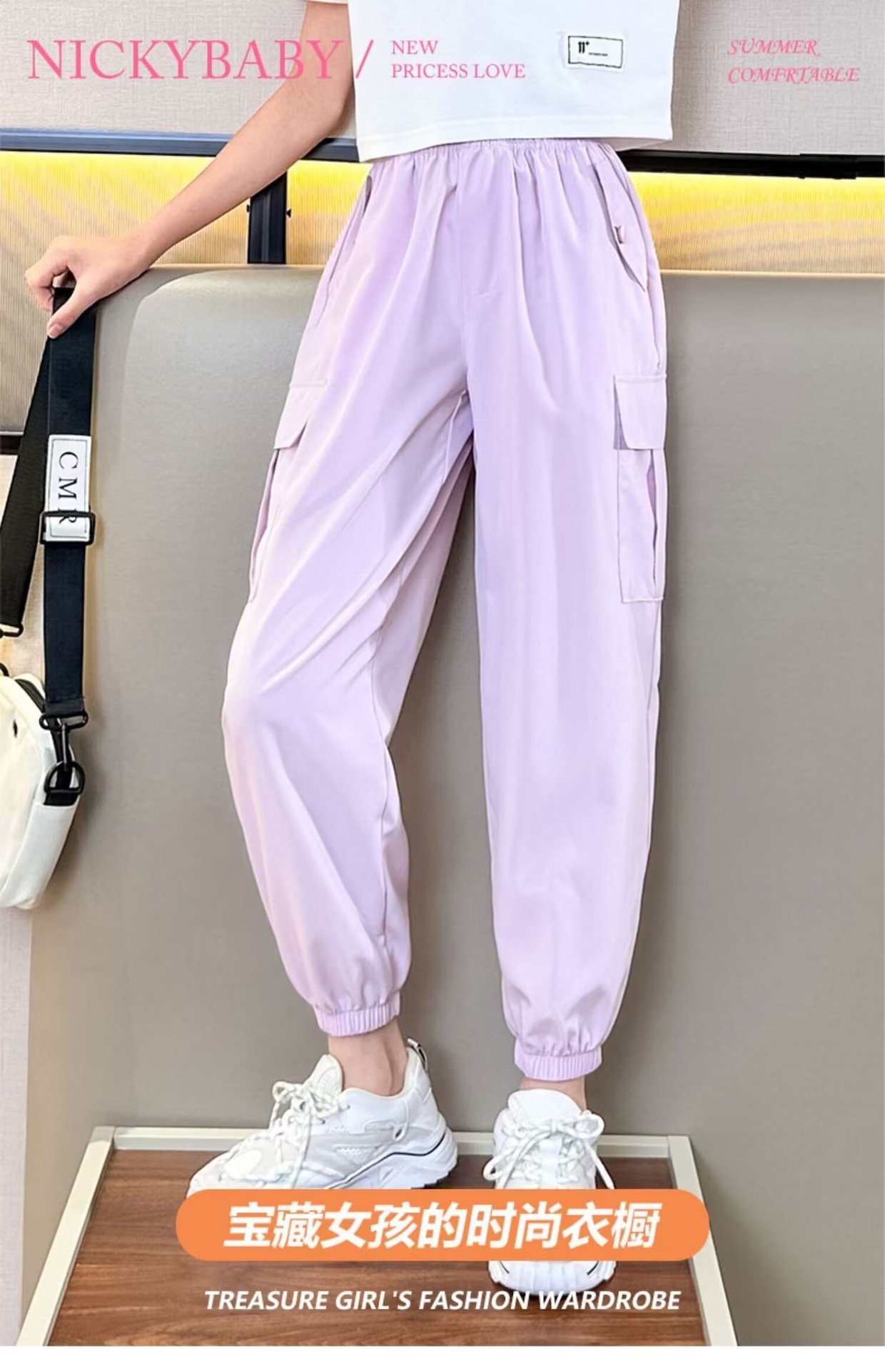 소녀 모기 방지 바지 여름 2024 새로운 얼음 실크 얇은 스포츠 바지 어린이 작업 바지 소녀 큰 어린이 여름 착용