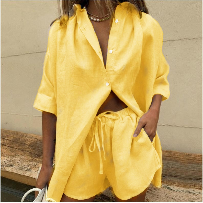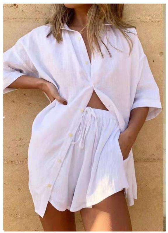 유럽과 미국의 국경 2023 대외 무역 여성 단색 싱글 브레스트 짧은 소매 셔츠 반바지 느슨한 패션 캐주얼 세트