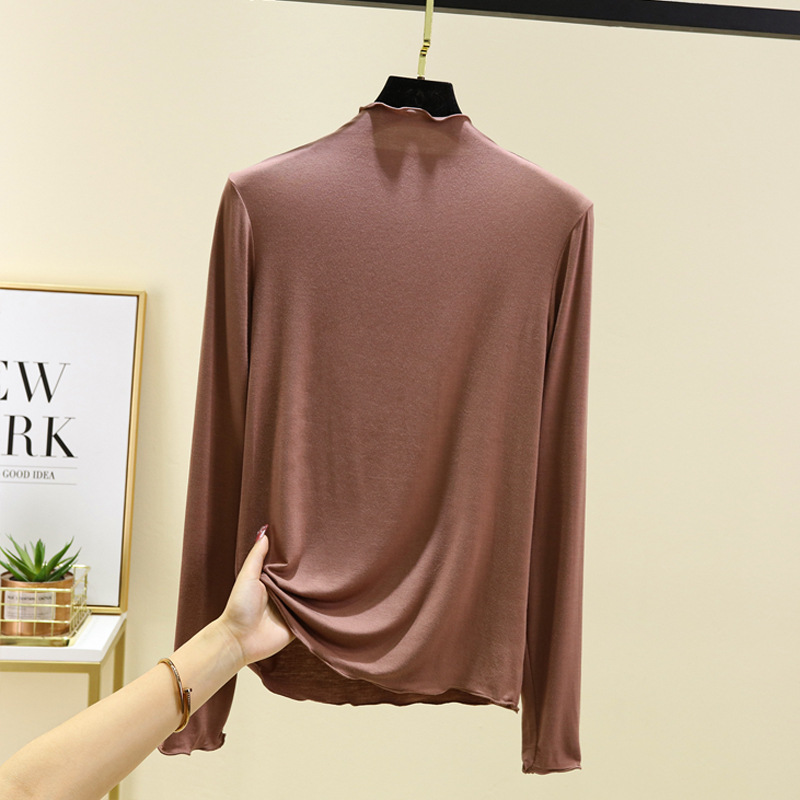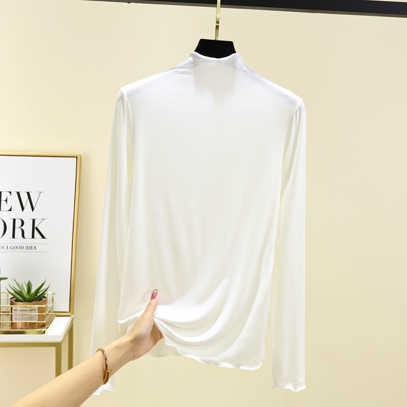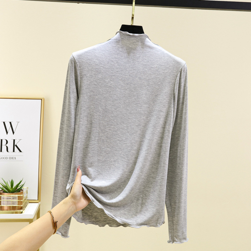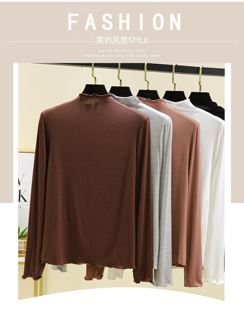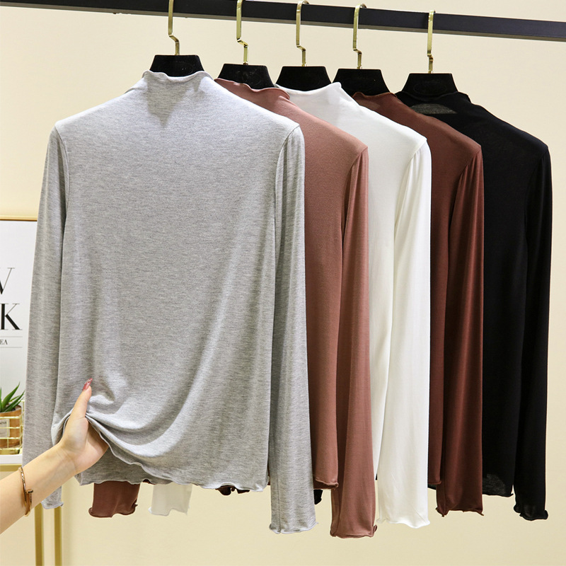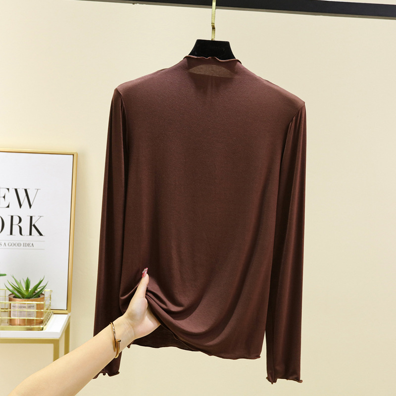 봄과 가을 반 높이 칼라베이스 셔츠 여성용 모달 플라잉 엣지 스타일시 올 매치 긴팔 티셔츠 얇은 슬림 핏 탑