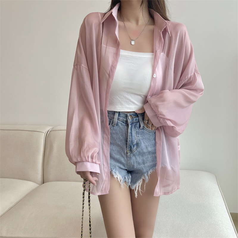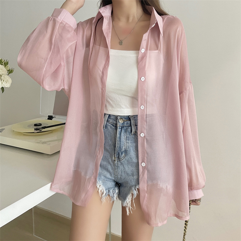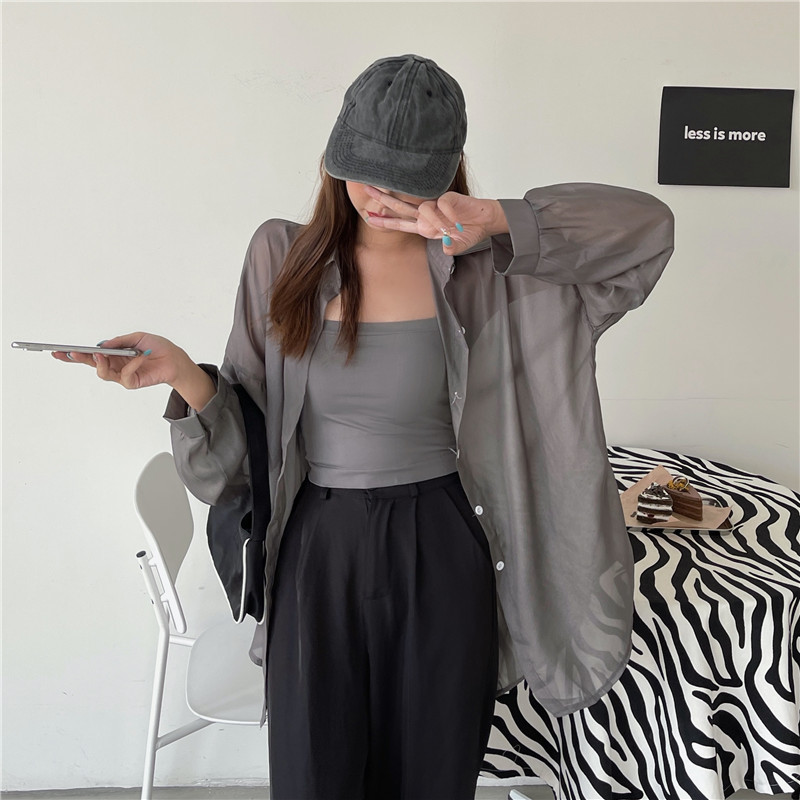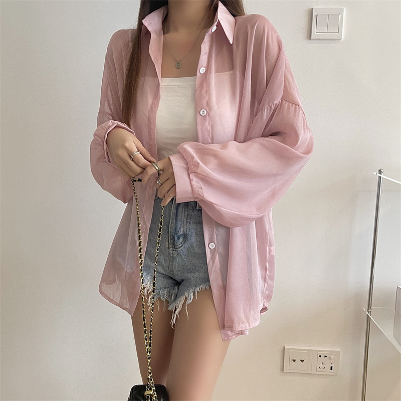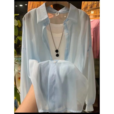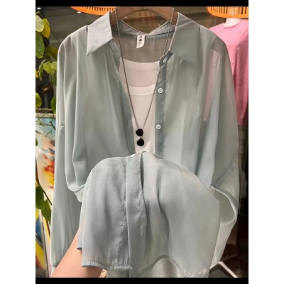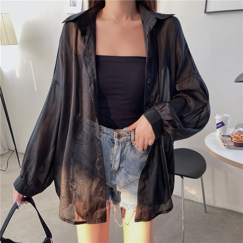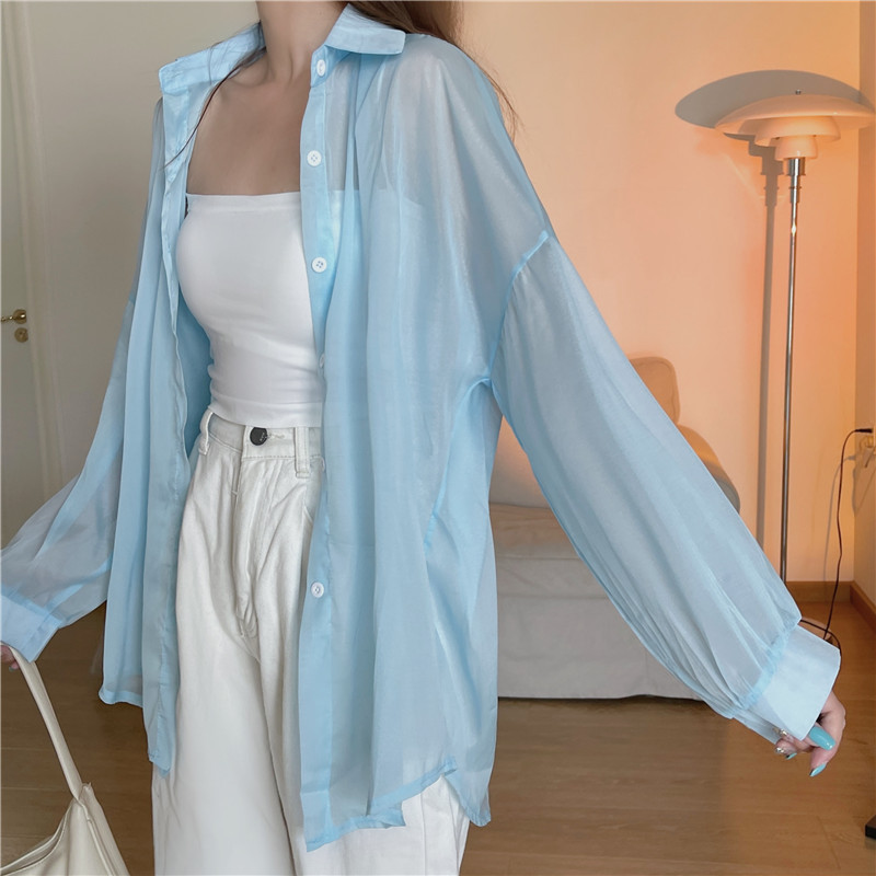 아이스 실크 자외선 차단 셔츠 여성 여름 얇은 카디건 디자인 틈새 드레이프 블라우스 셔츠 자켓 탑