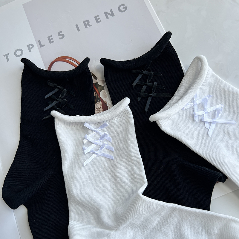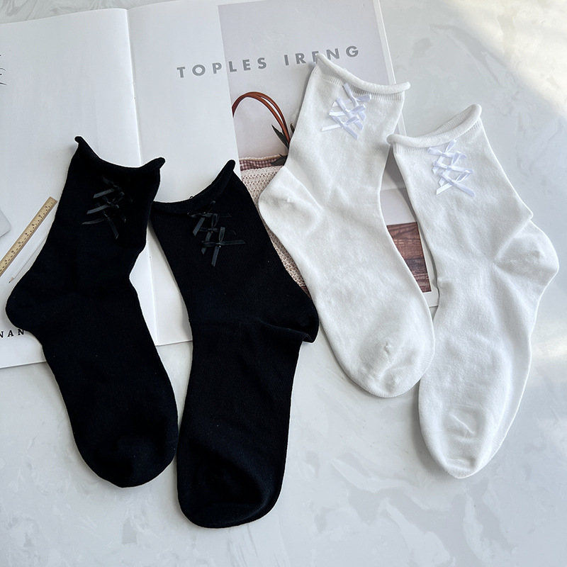얇은 컬 양말 사이드 보우 미드 튜브 양말 여성용 코튼 양말 한국식 스위트 걸스 양말