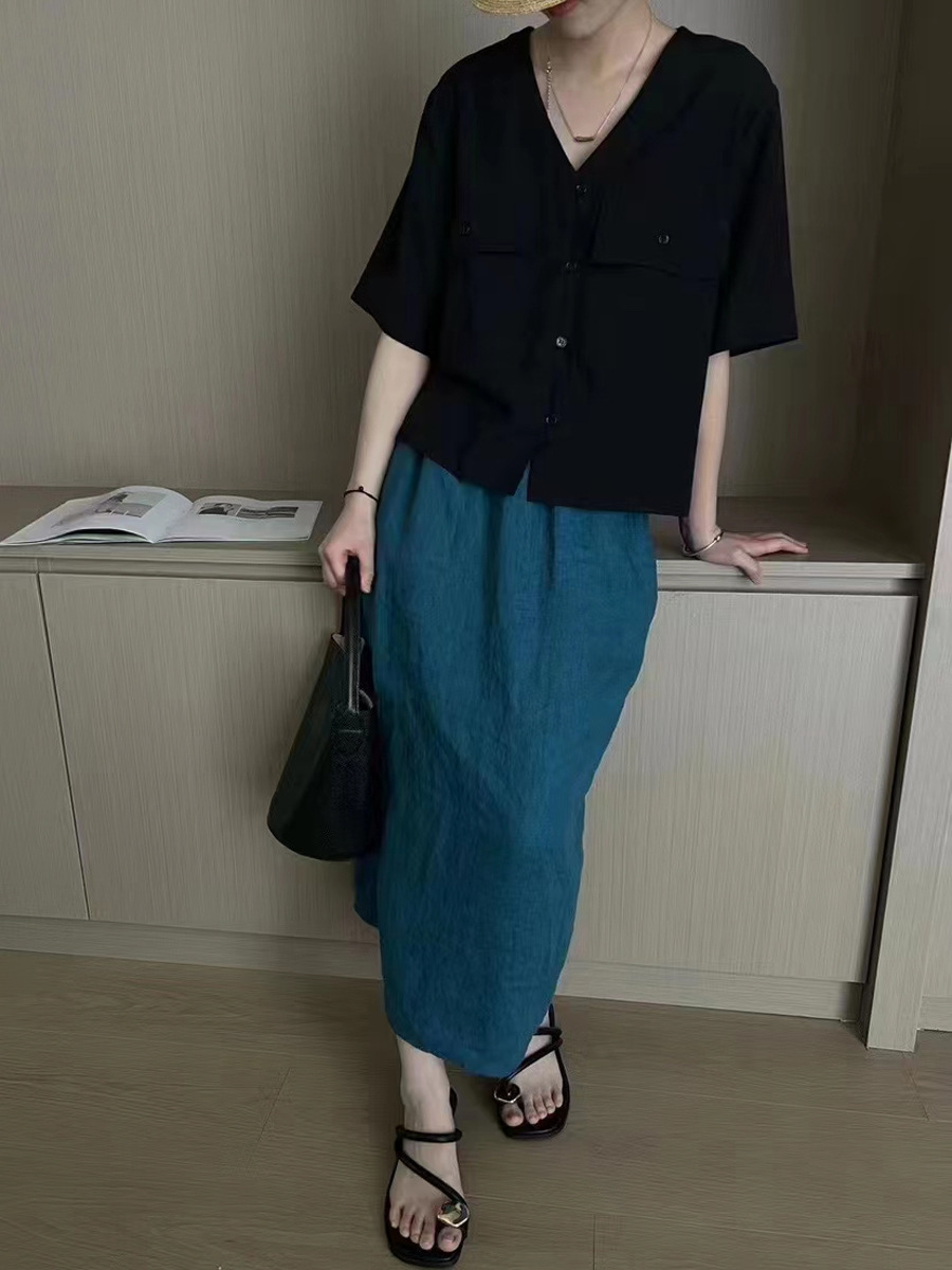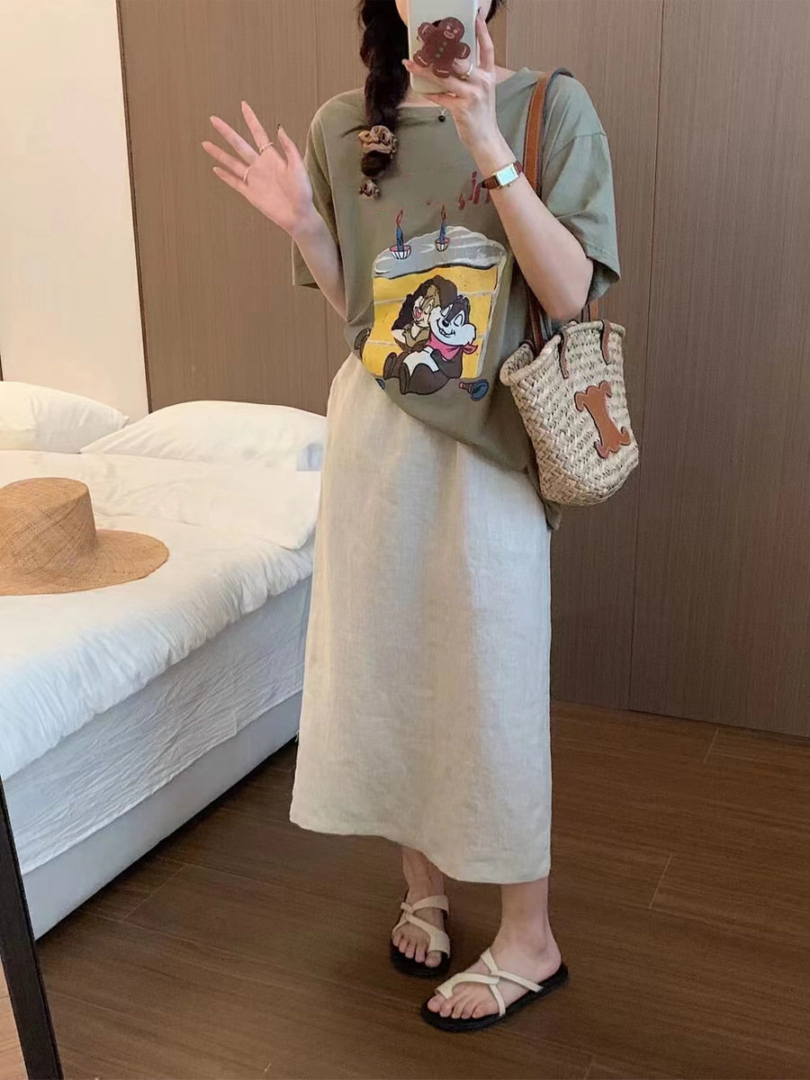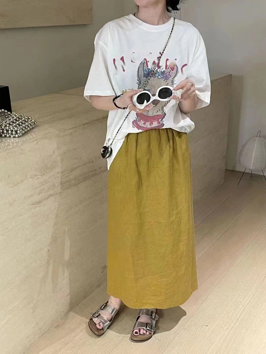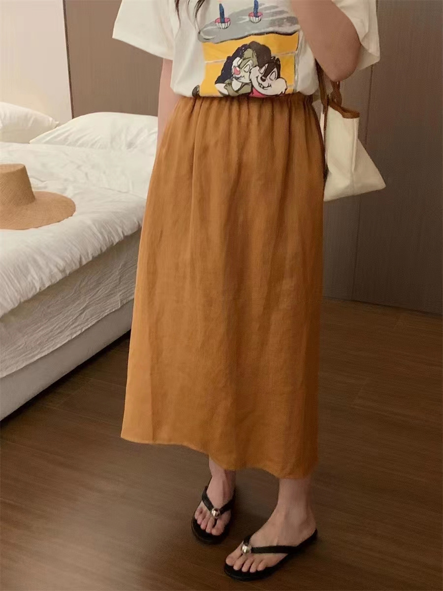 유행 캐주얼 솔리드 컬러 올 매치 리넨 스커트 여자 여름 스트레치 허리 슬림 긴 느슨한 A 라인 원피스 트렌디스토어 가기