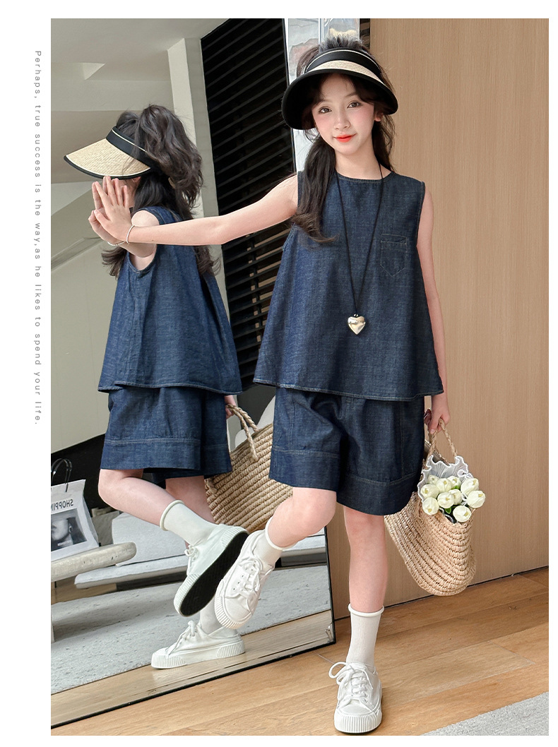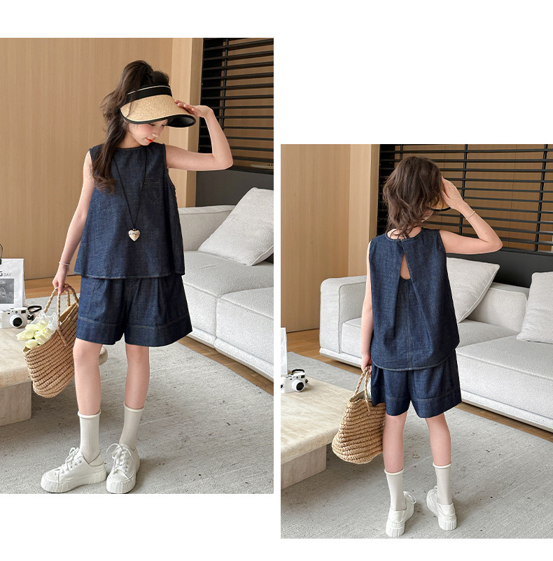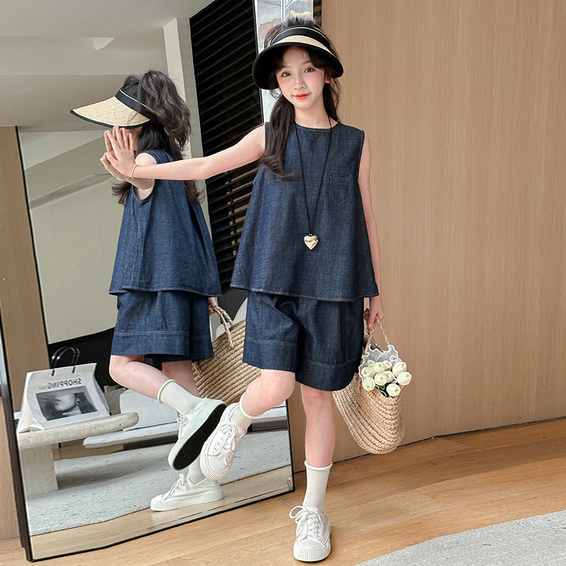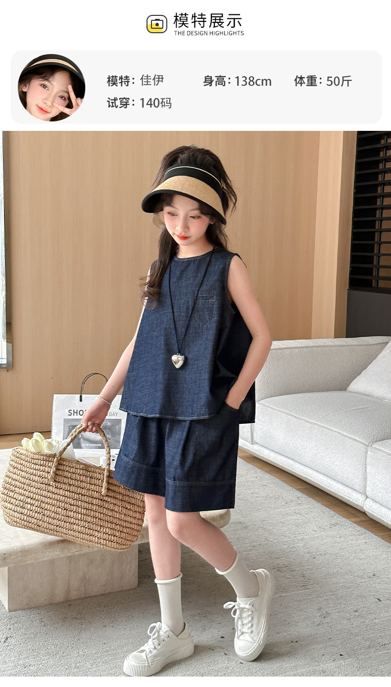 여자 여름 옷 데님 반팔 세트 2024 여자 큰 어린이 옷 서양식 유행 인터넷 연예인 여름 유행 옷스토어 가기
