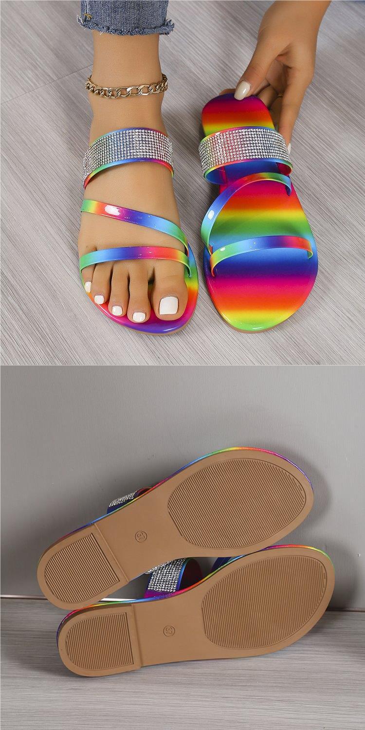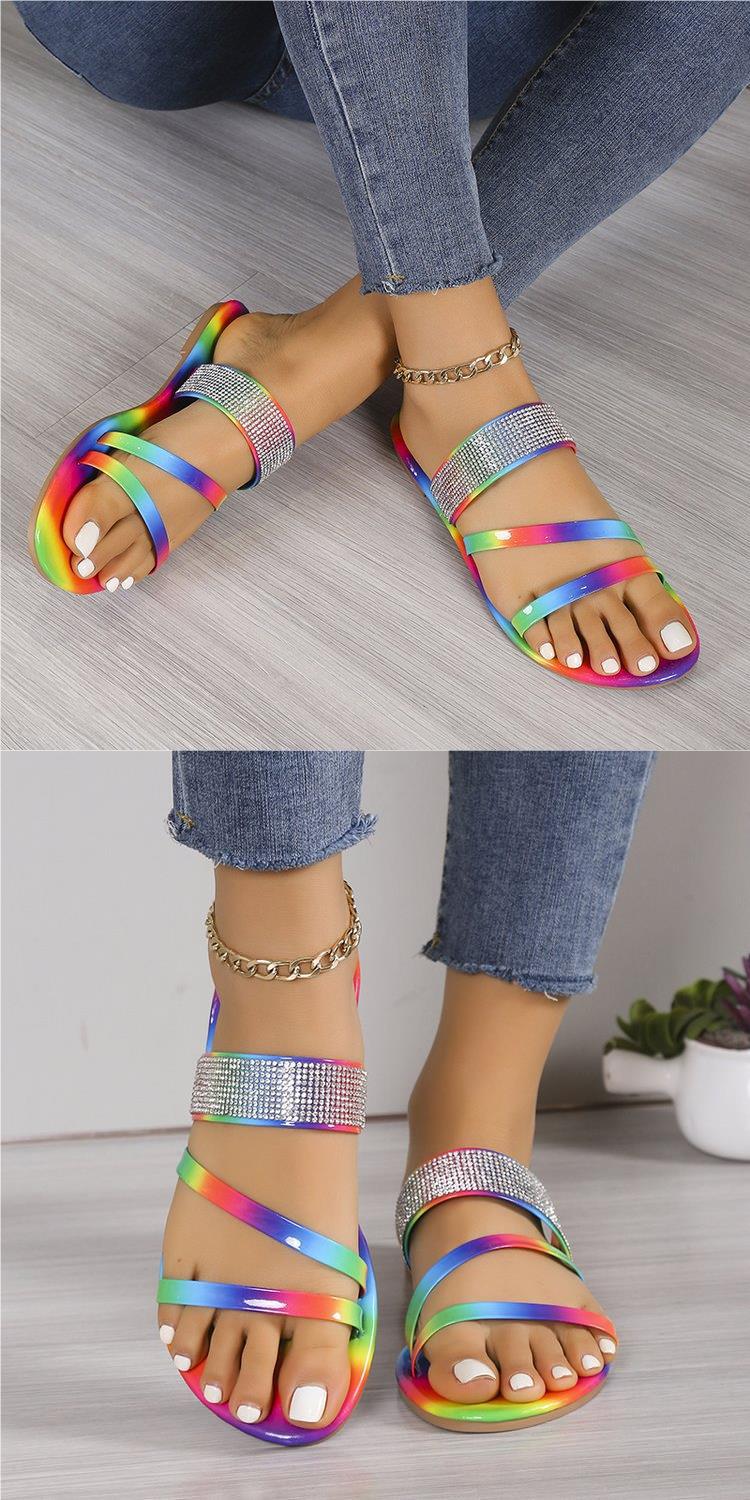 대외 무역 플러스 사이즈 컬러 요정 스타일 라인스톤 슬리퍼 여성 2024 여름 유럽과 미국의 라운드 헤드 매직 컬러 비치 슬리퍼스토어 가기