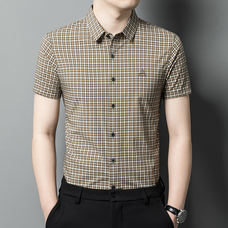 2023夏季新款男士青年轻商务简约格子翻领短袖衬衫6216