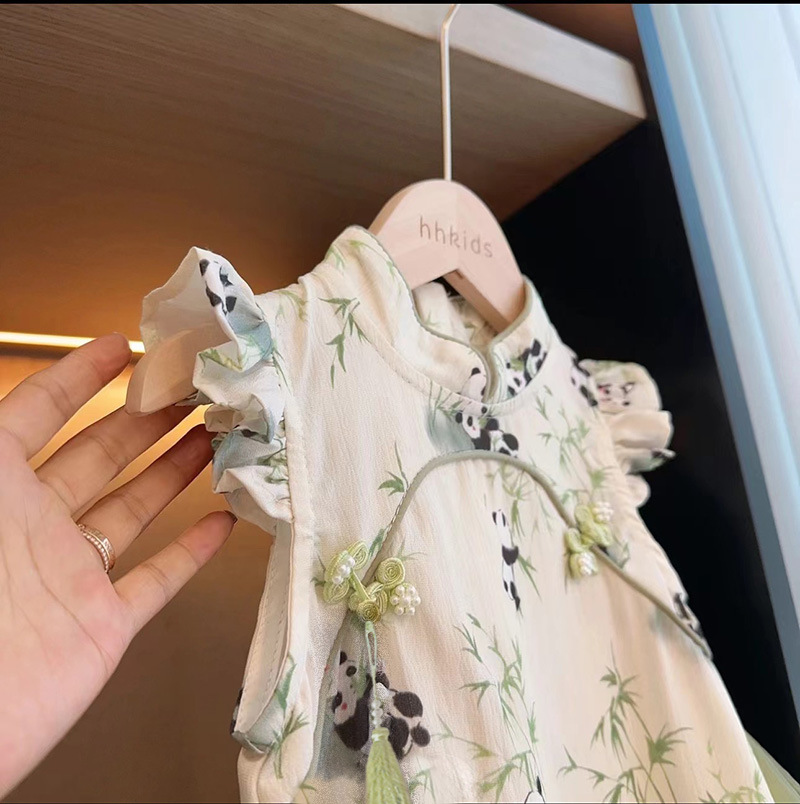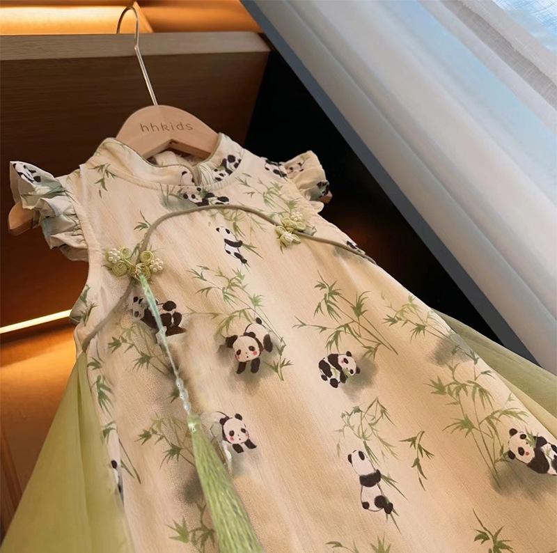 2024 년 여름 새로운 도착 트렌디 버클 인쇄 우아한 치마를 원피스 웨스턴 스타일 소녀의 플라잉 슬리브 내셔널 스타일 팬더 메쉬스토어 가기