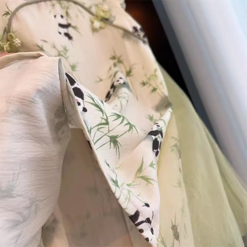 2024 년 여름 새로운 도착 트렌디 버클 인쇄 우아한 치마를 원피스 웨스턴 스타일 소녀의 플라잉 슬리브 내셔널 스타일 팬더 메쉬