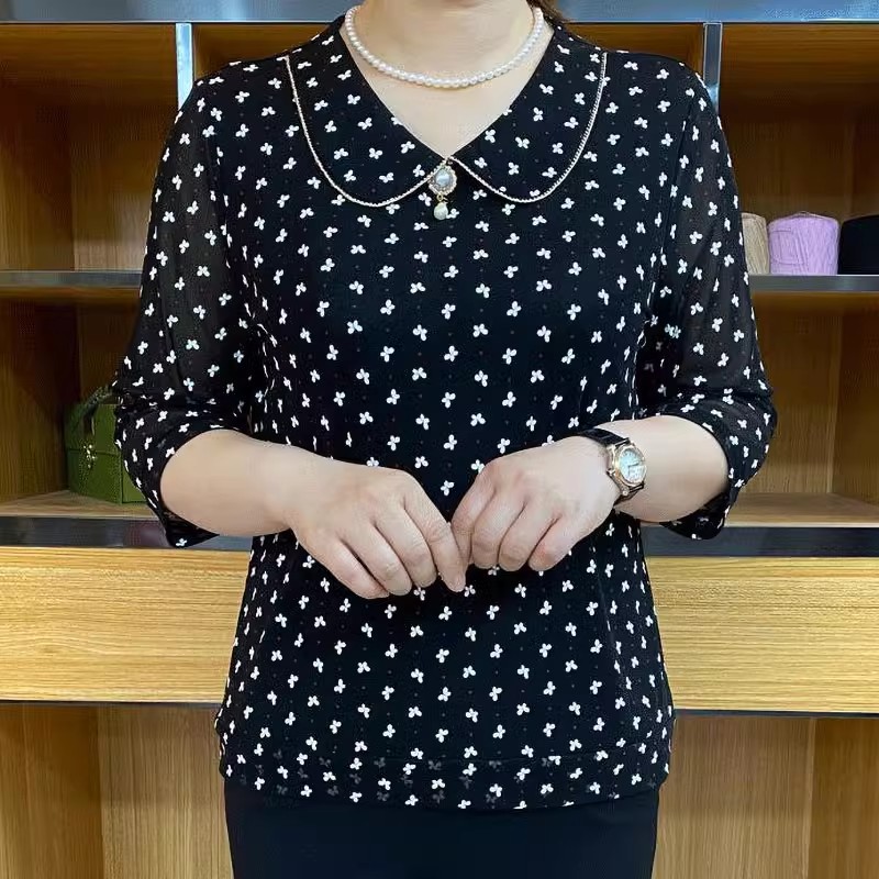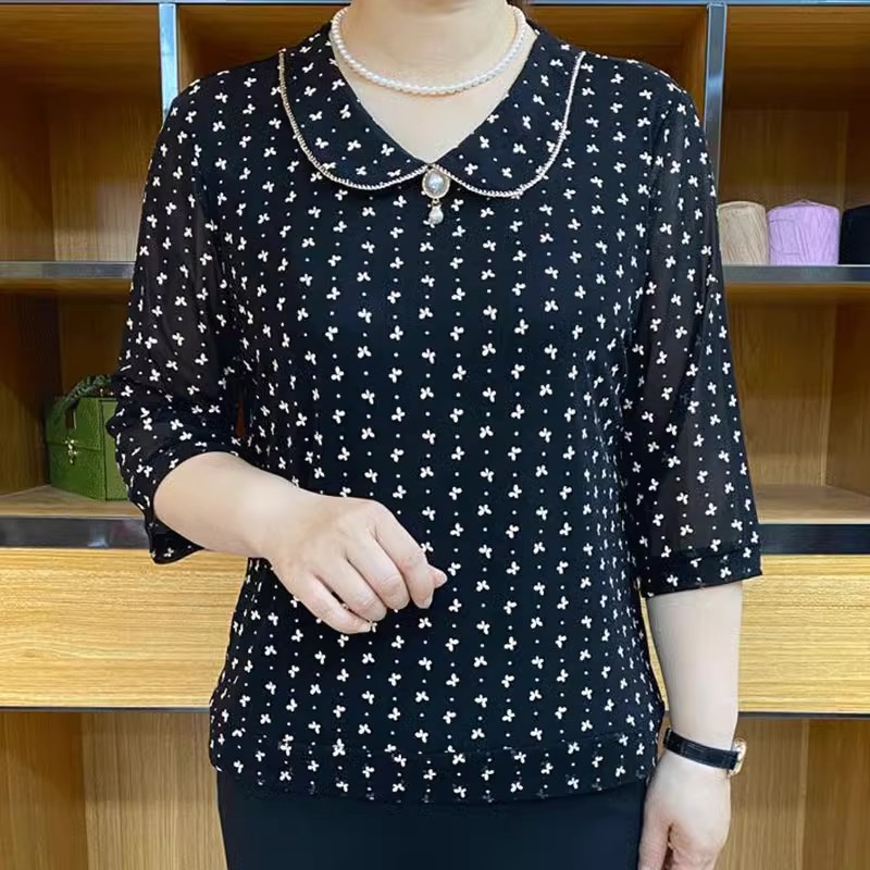 고급 쉬폰 셔츠 7 점 소매 여름 새로운 배꼽 덮음 중년 및 노인 어머니의 원피스 덮는 최고 우아한 올 매치 고기스토어 가기