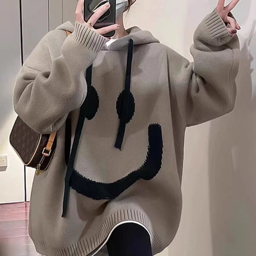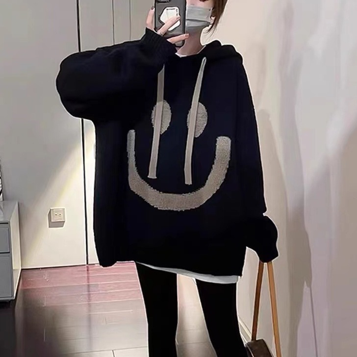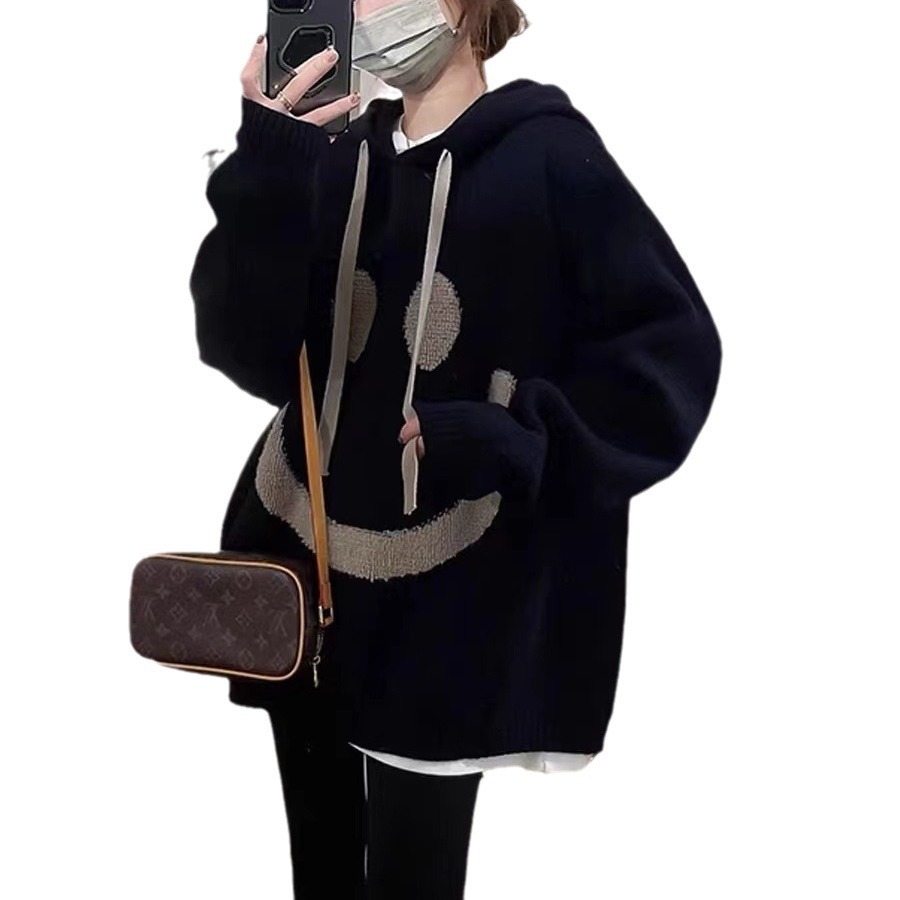 후드 블랙 살구색 대비 컬러 니트웨어 여성용 가을과 겨울 느슨한 2024 새로운 가을과 겨울 게으른 틈새 스웨터스토어 가기