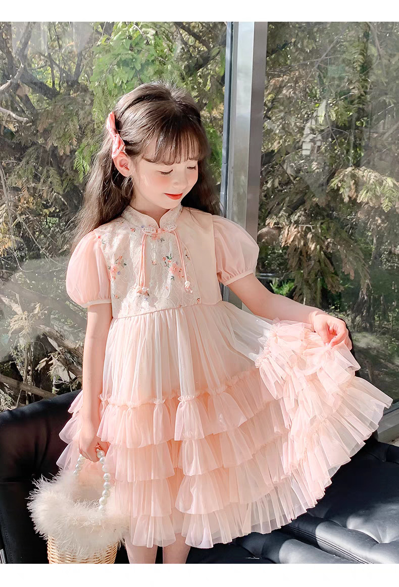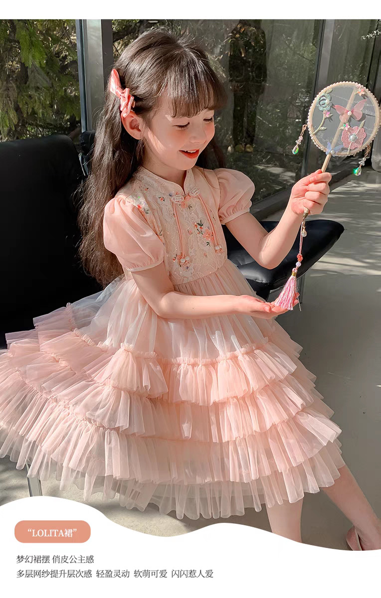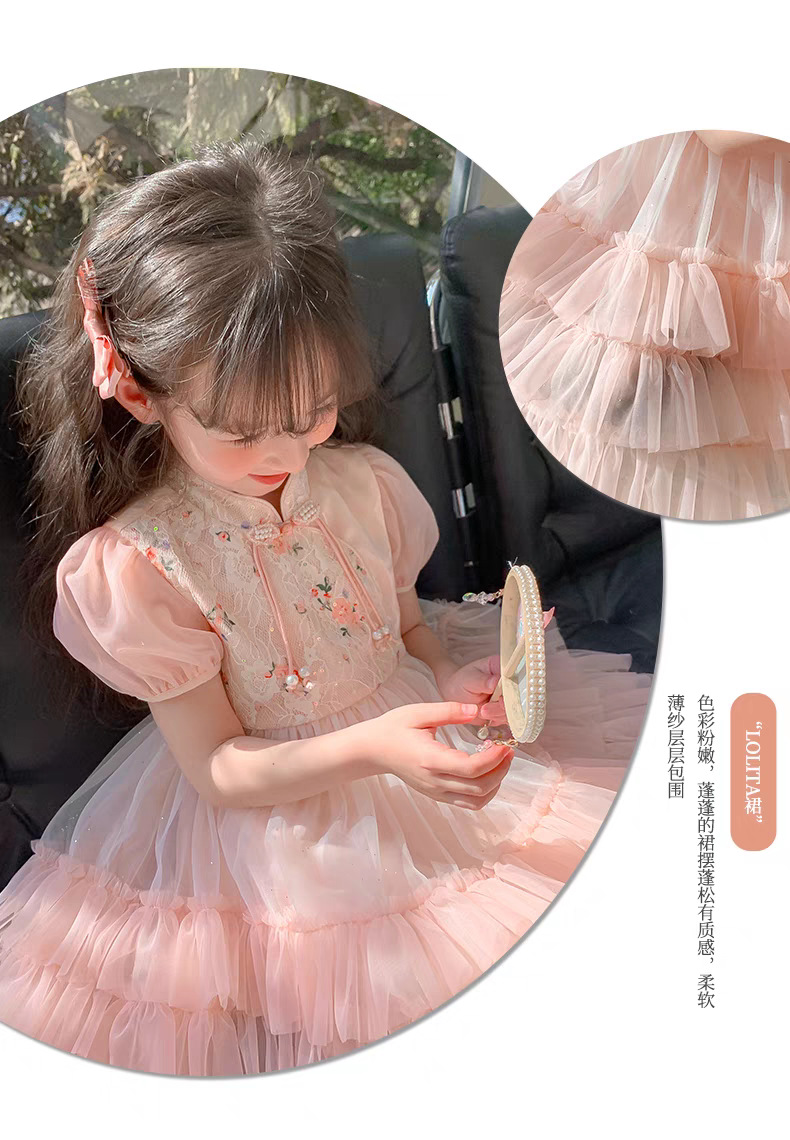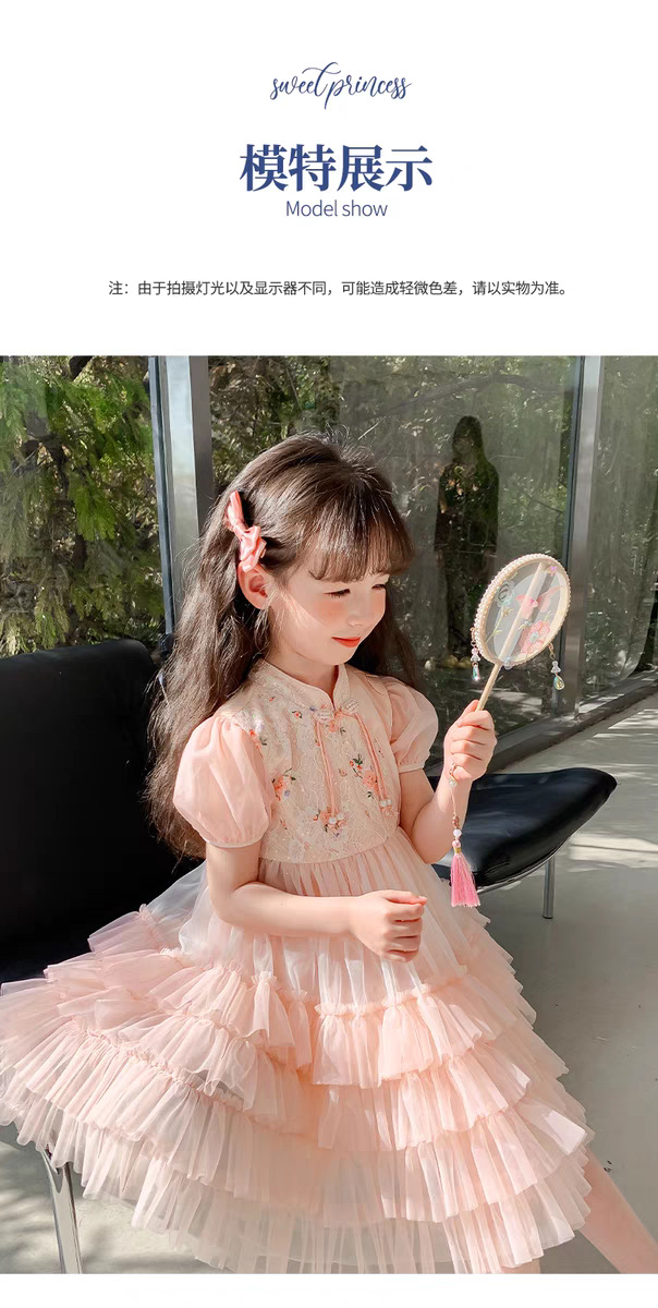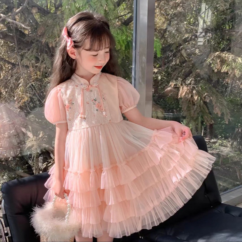 2024 여름 여자아이들을 위한 새로운 중국풍 드레스, 고대풍 한복, 여자아이들을 위한 세련된 퍼프 소매 공주 드레스, 공연용 반팔 드레스스토어 가기