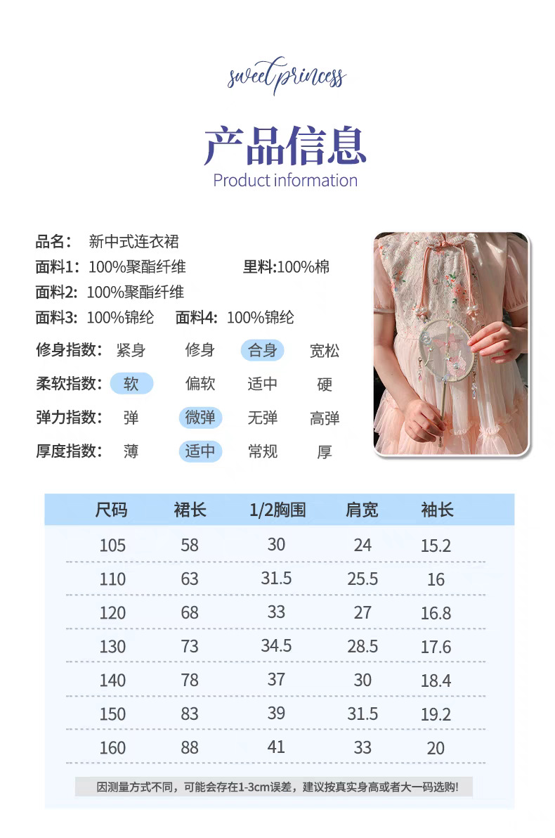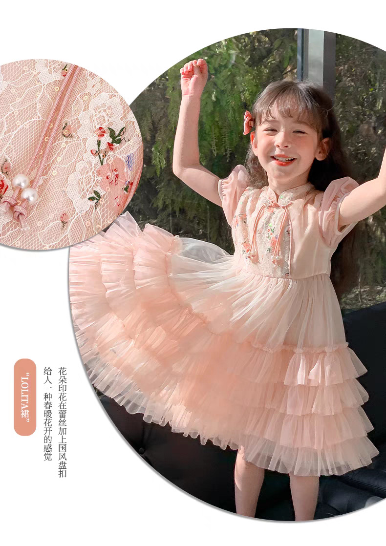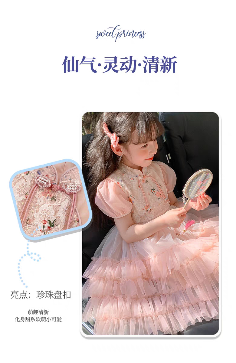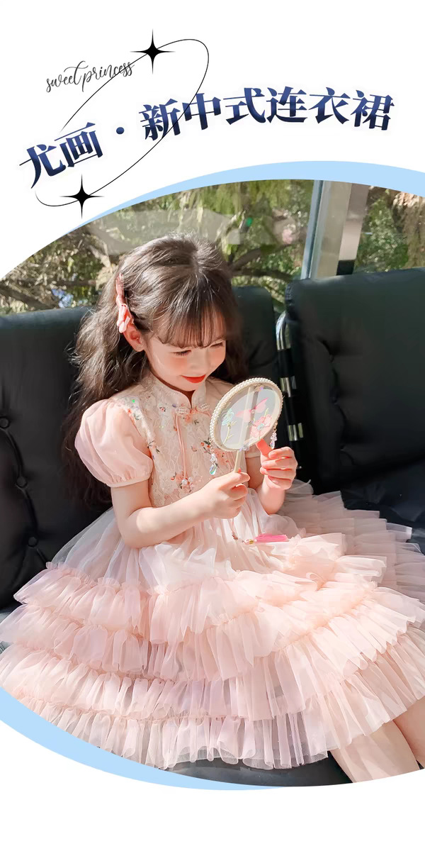 2024 여름 여자아이들을 위한 새로운 중국풍 드레스, 고대풍 한복, 여자아이들을 위한 세련된 퍼프 소매 공주 드레스, 공연용 반팔 드레스스토어 가기