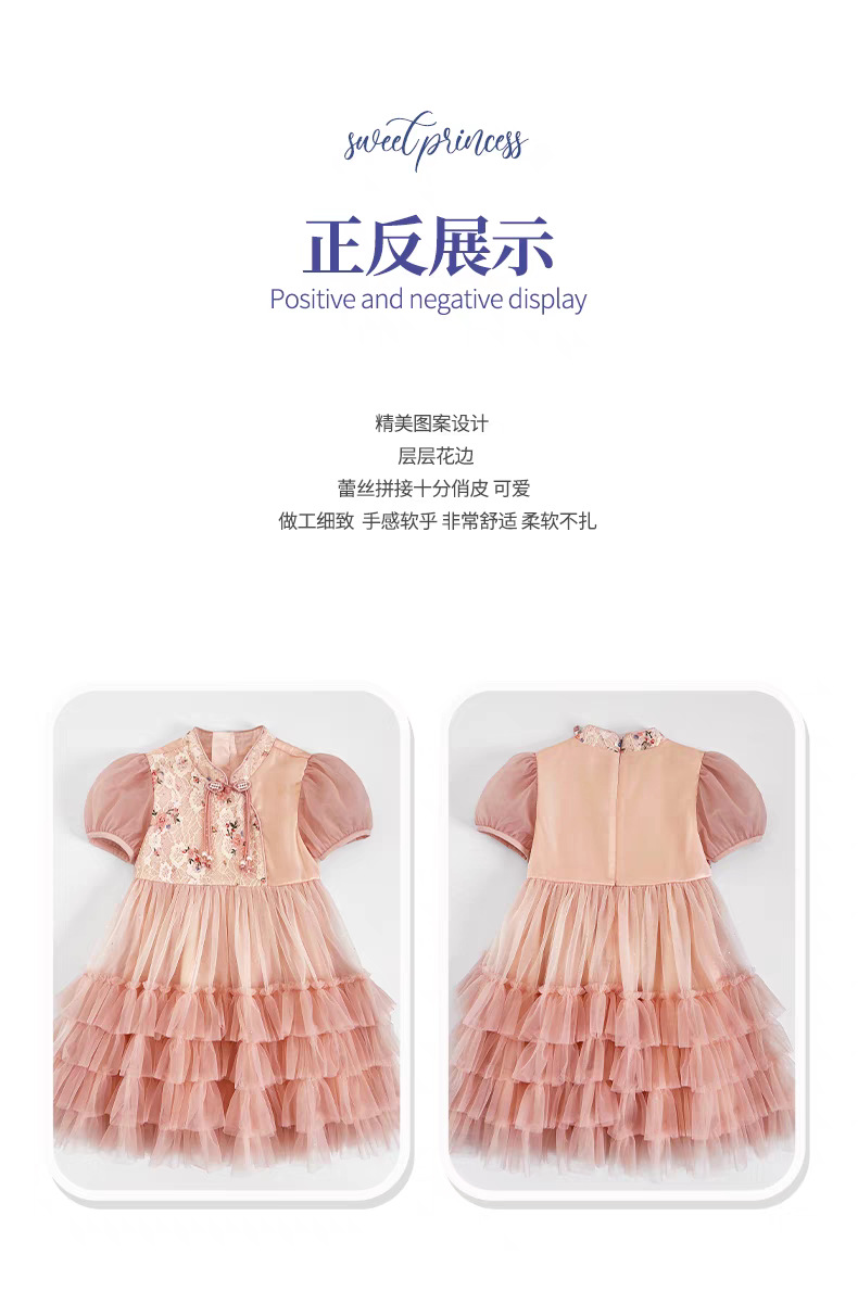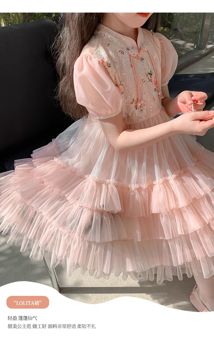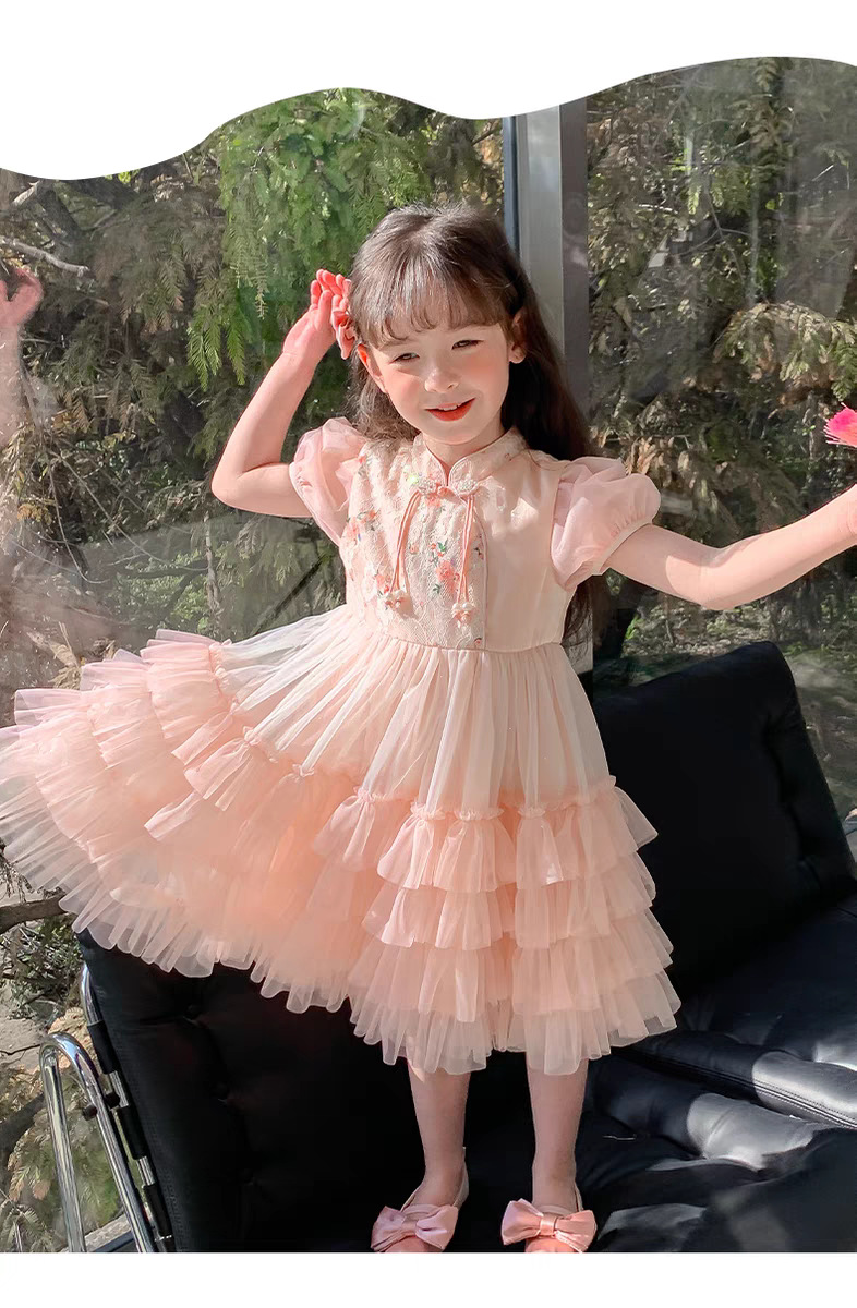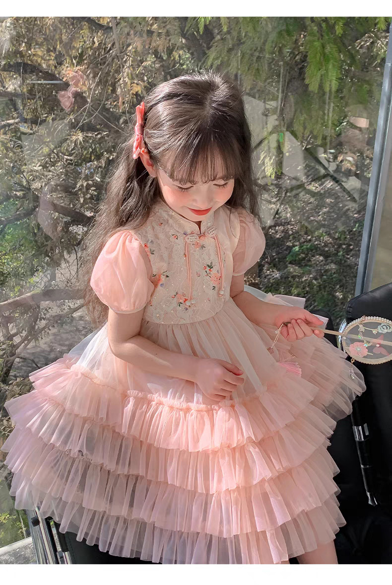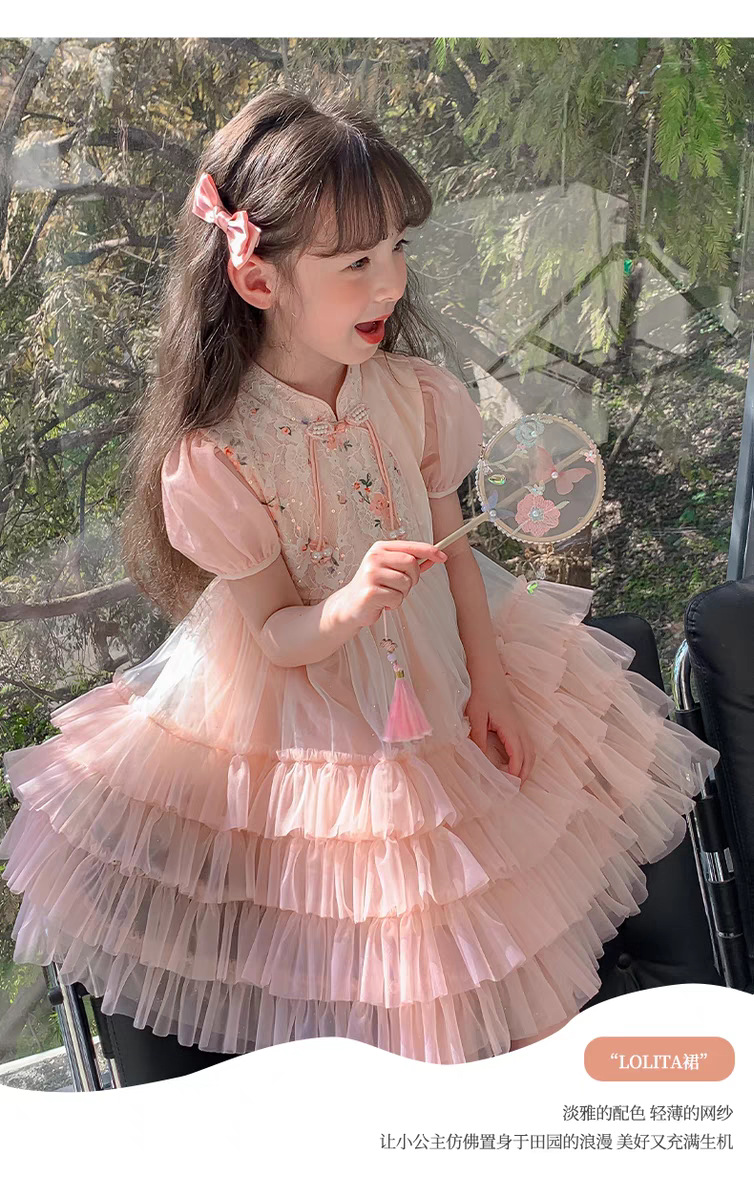 2024 여름 여자아이들을 위한 새로운 중국풍 드레스, 고대풍 한복, 여자아이들을 위한 세련된 퍼프 소매 공주 드레스, 공연용 반팔 드레스