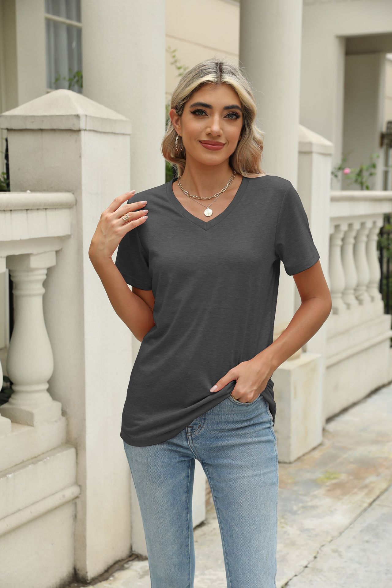 솔리드 컬러 2024 여름 새로운 유럽과 미국 여성 v 넥 패션 느슨한 반팔 티셔츠 여성