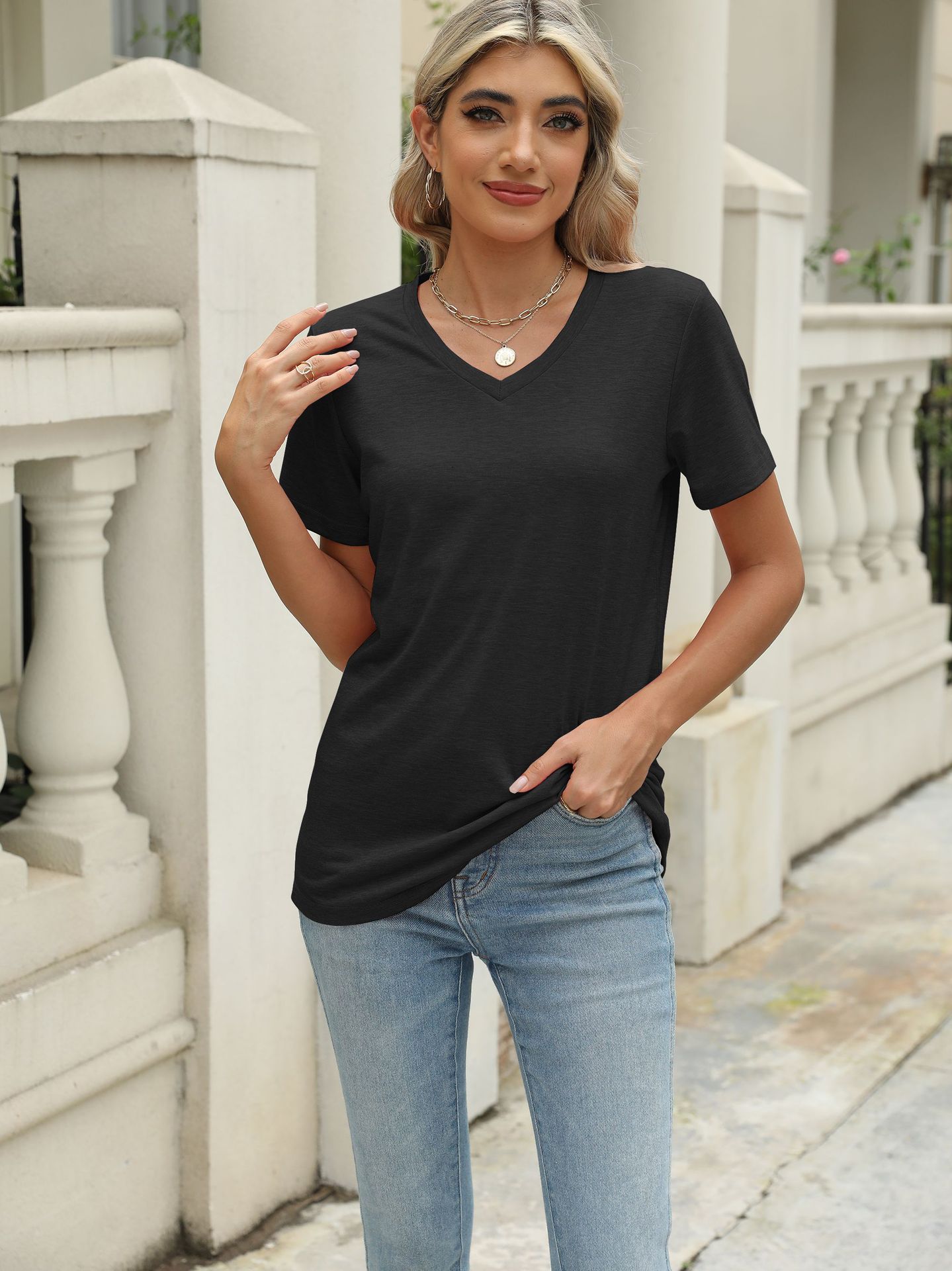 솔리드 컬러 2024 여름 새로운 유럽과 미국 여성 v 넥 패션 느슨한 반팔 티셔츠 여성스토어 가기