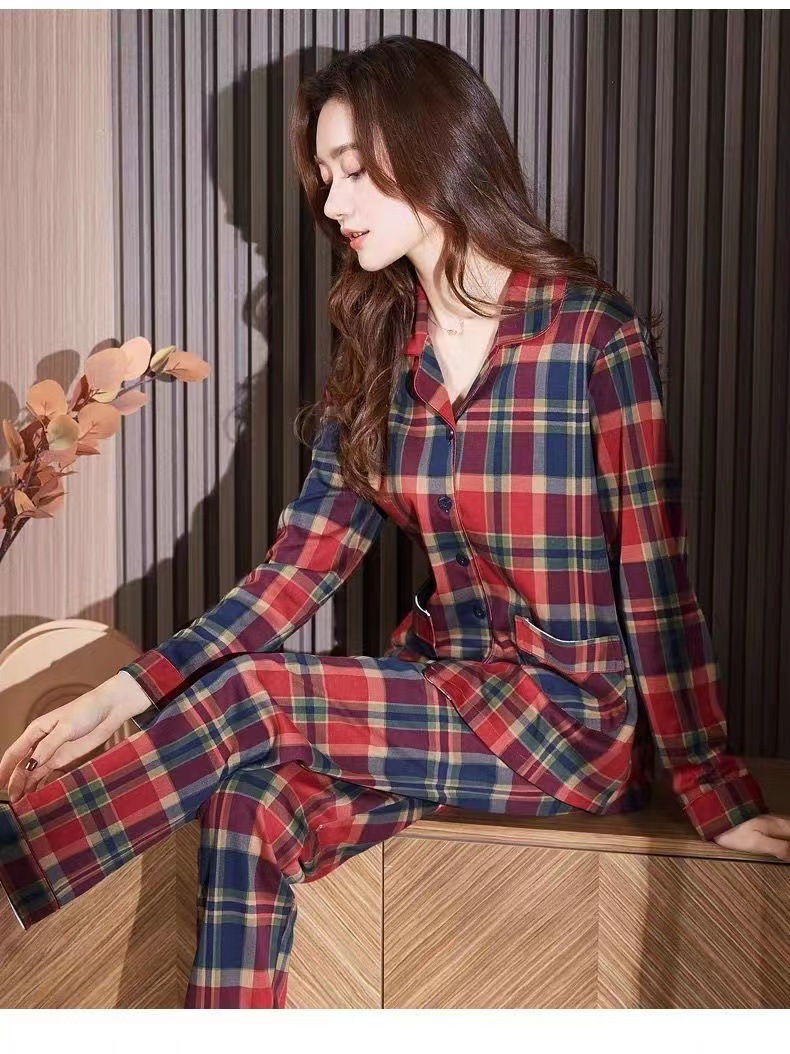 여성을위한 붉은 격자 무늬 잠옷 봄, 가을 모조 면화 긴팔 대형 카디건 옷깃은 여성용 홈웨어 슈트 외부에서 착용 가능